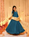 Complementing the gown is a contrast Teby silk dupatta, beautifully adorned with heavy floral digital prints and elegant lace detailing, adding charm and sophistication to the entire outfit.