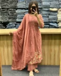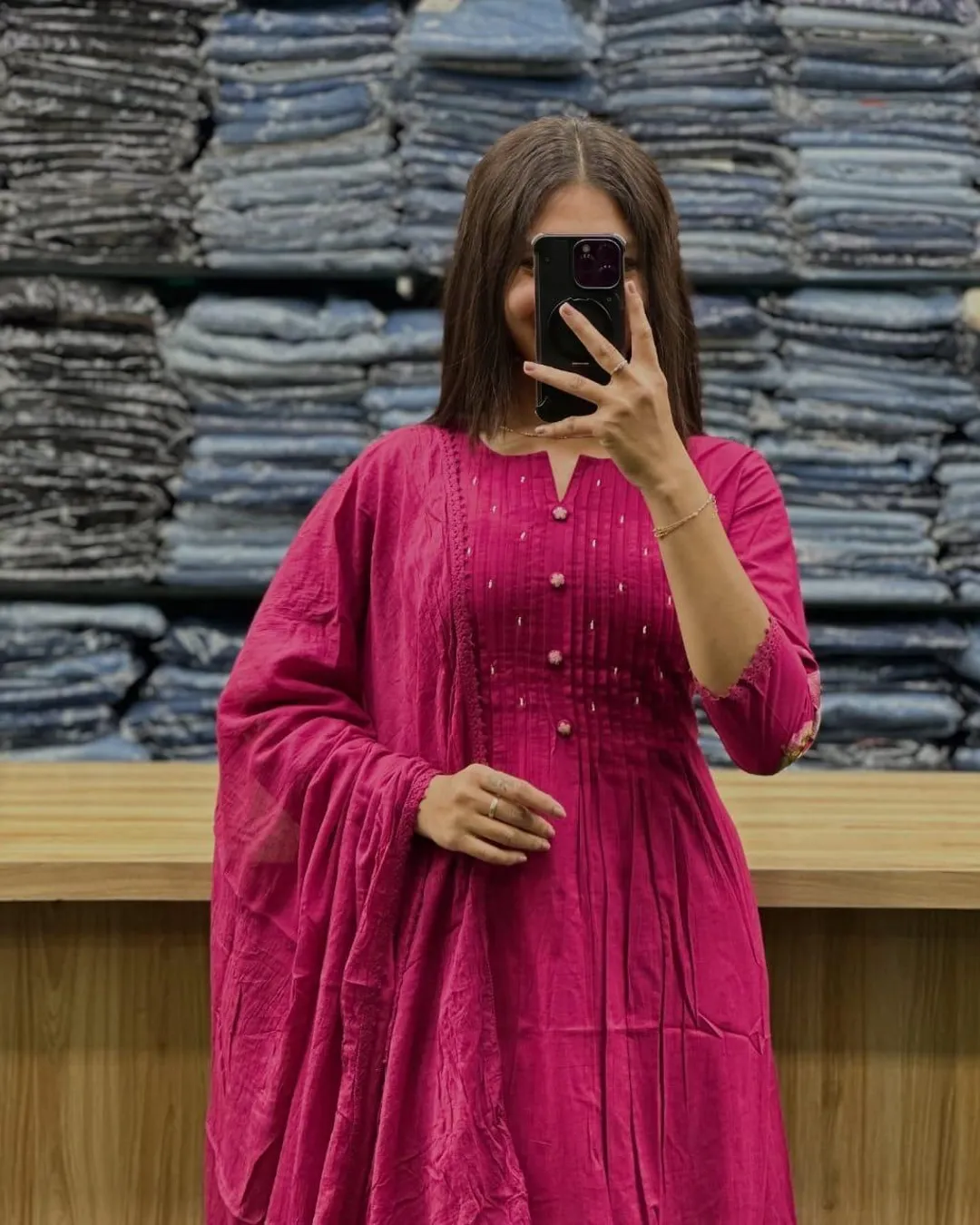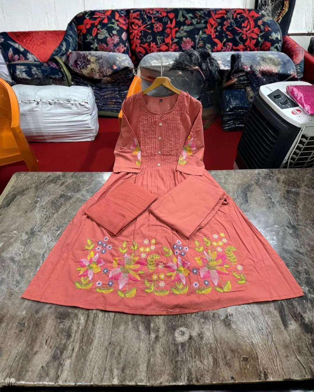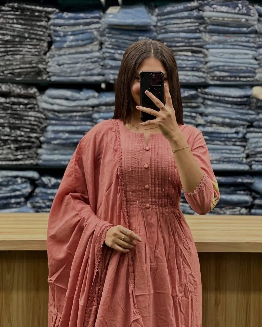 Step into elegance with this newly launched Anarkali kurta set, designed to give you a dreamy and graceful look. Crafted from soft and breathable cotton fabric, this outfit ensures comfort while maintaining a stylish ethnic appeal.