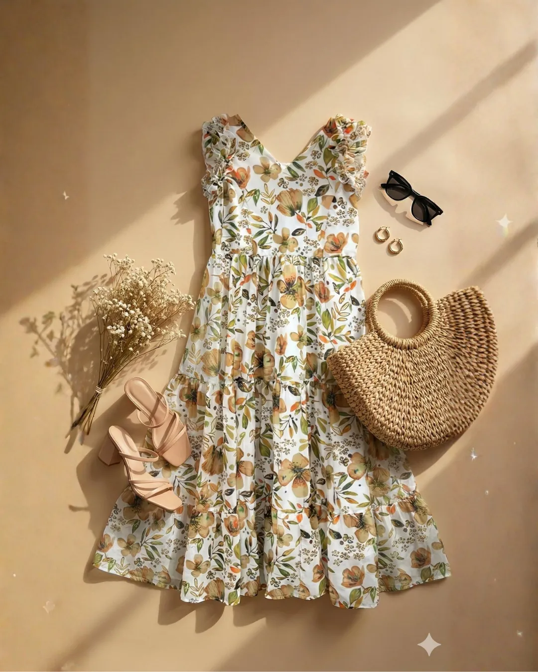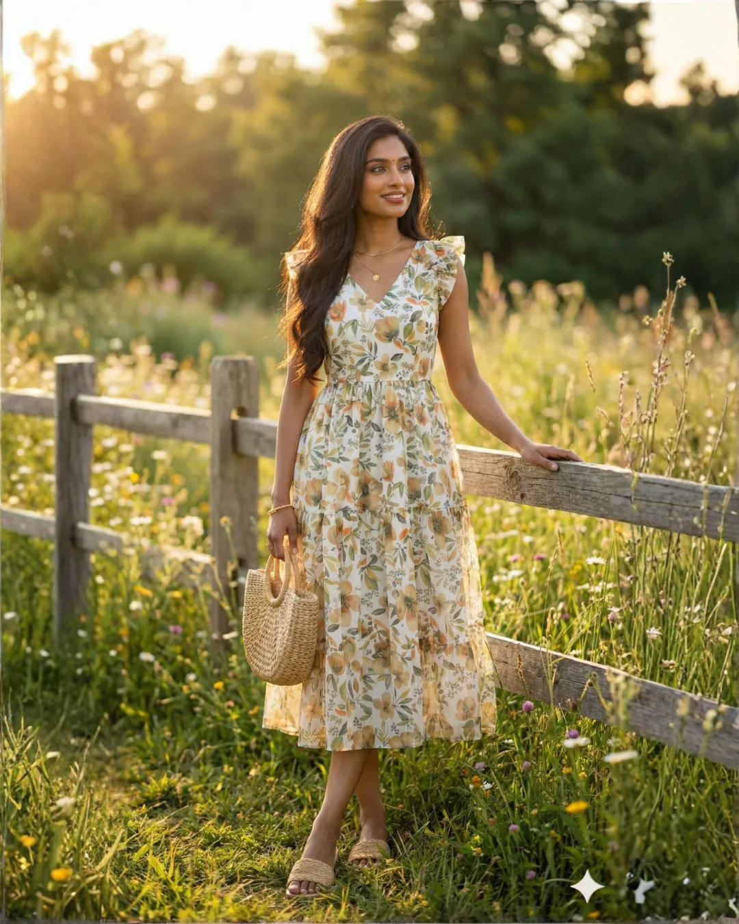 Graceful floral chiffon gown with ruffled sleeves, V-neckline, and pleated flowy design—perfect for brunches and daytime celebrations.