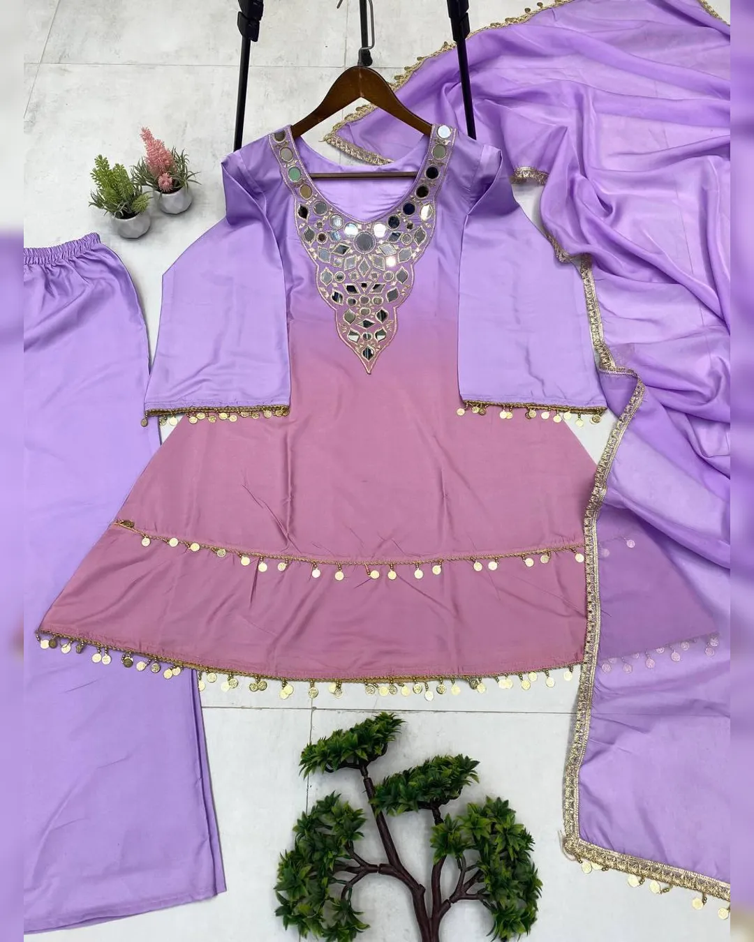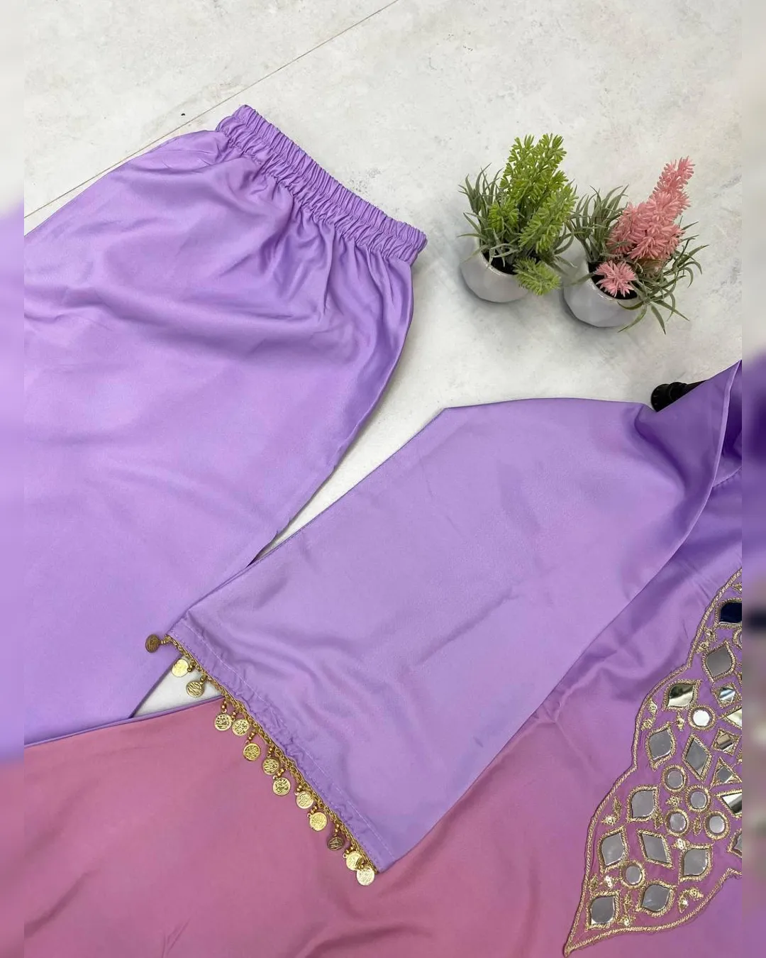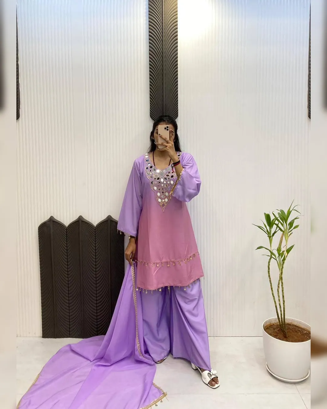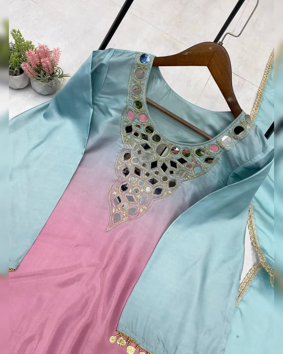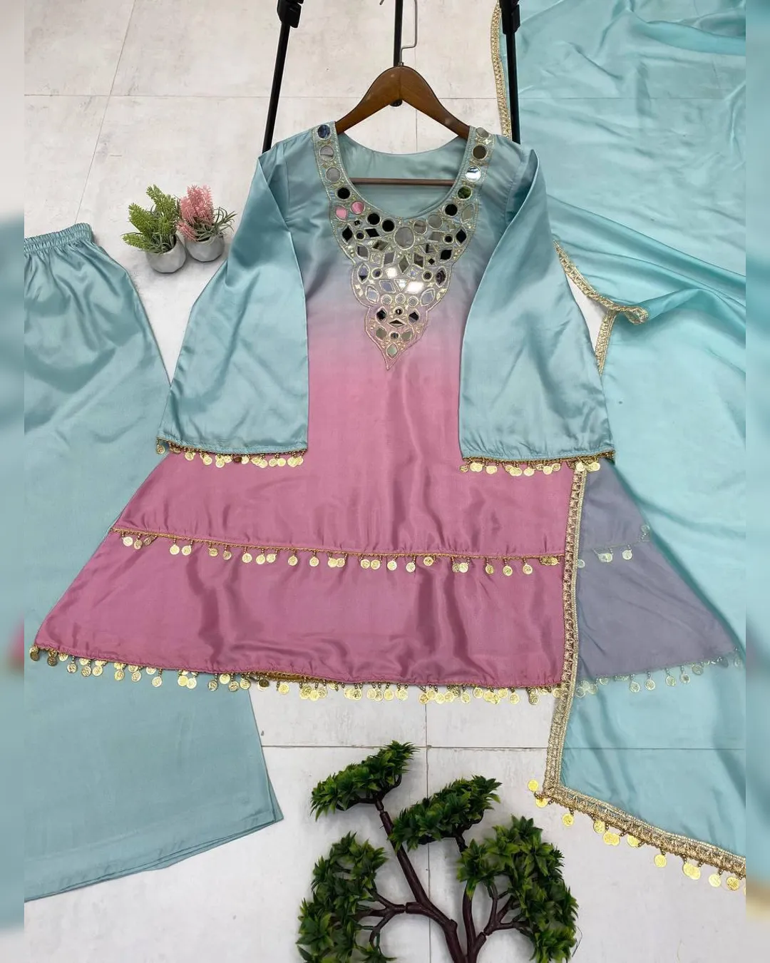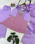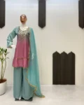 Step into effortless elegance with this exclusive 3-piece plazzo set, designed to blend comfort with festive charm. Crafted in premium printed crepe silk, the set features a beautifully embroidered and mirror-work top paired with a flowy plazzo and a soft printed organza dupatta. Perfect for festive occasions, casual celebrations, and elegant day wear, this outfit offers a flattering fit with a lightweight feel, making it a must-have addition to your ethnic wardrobe.