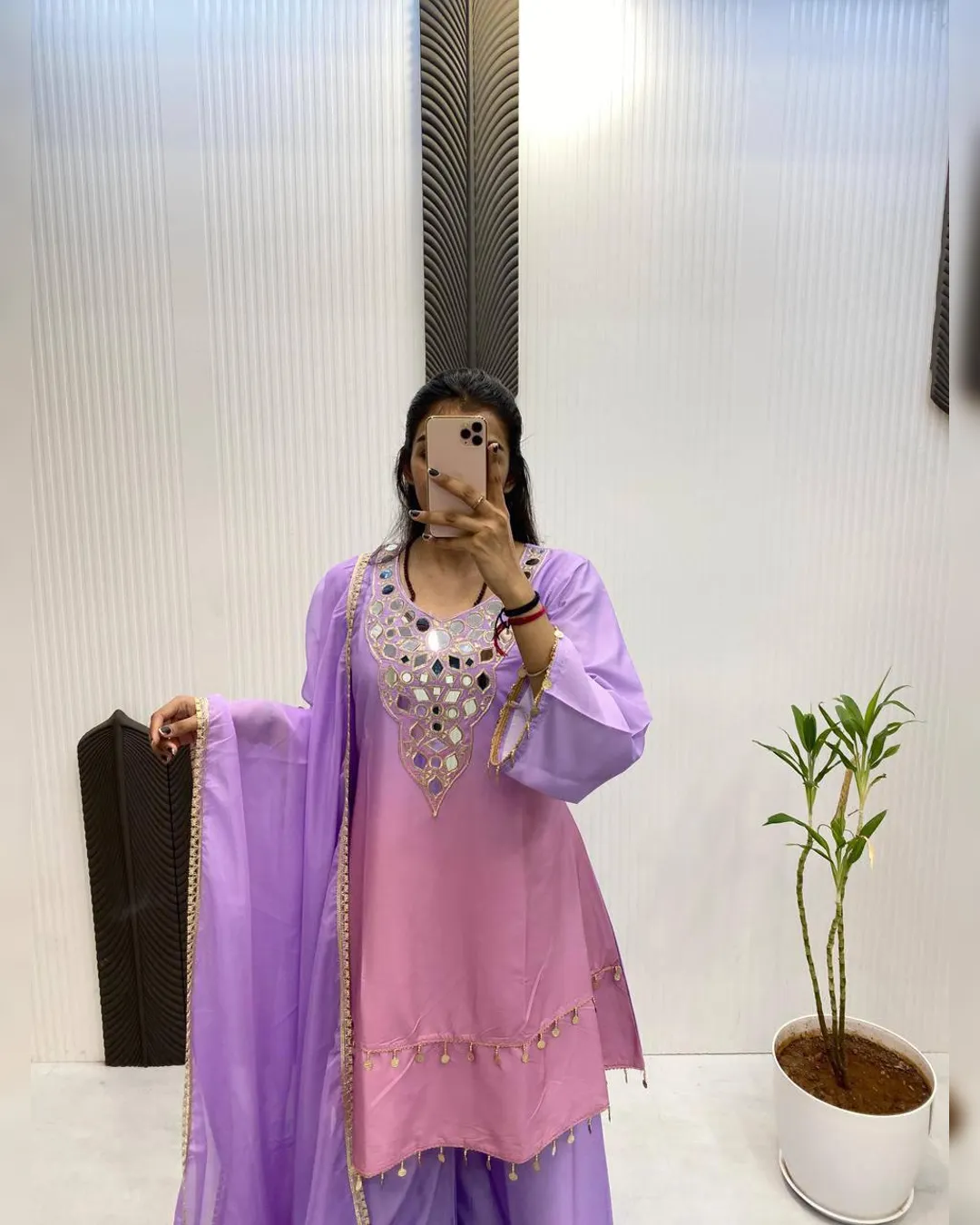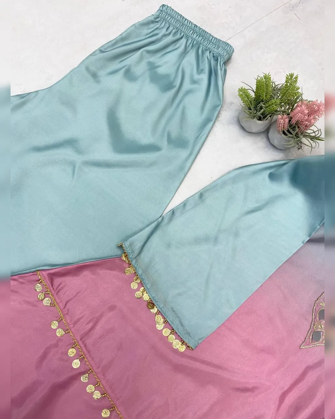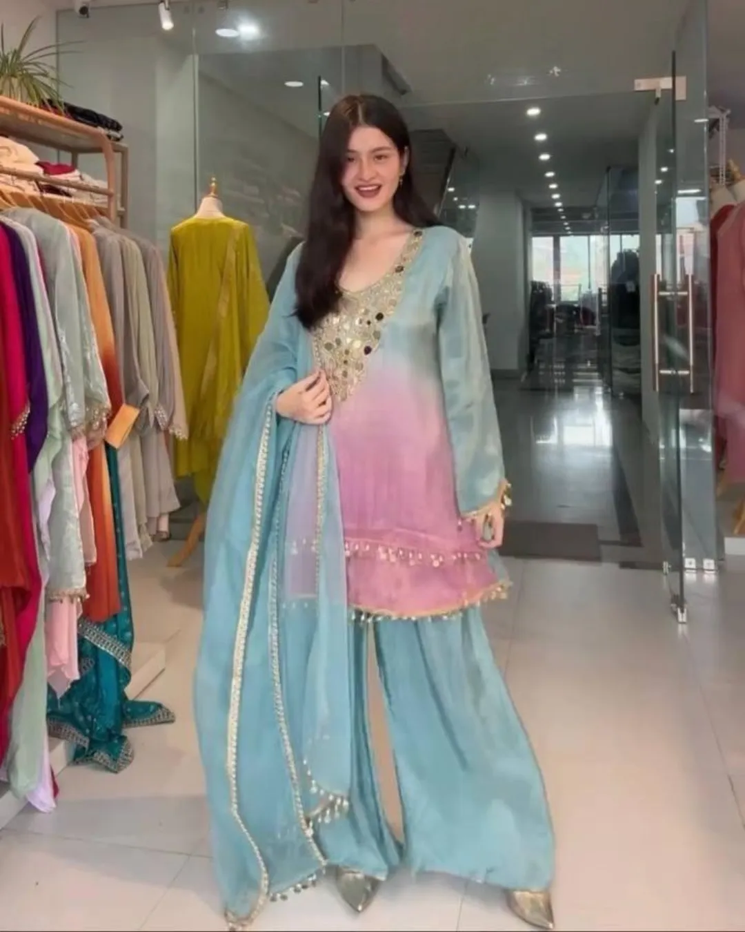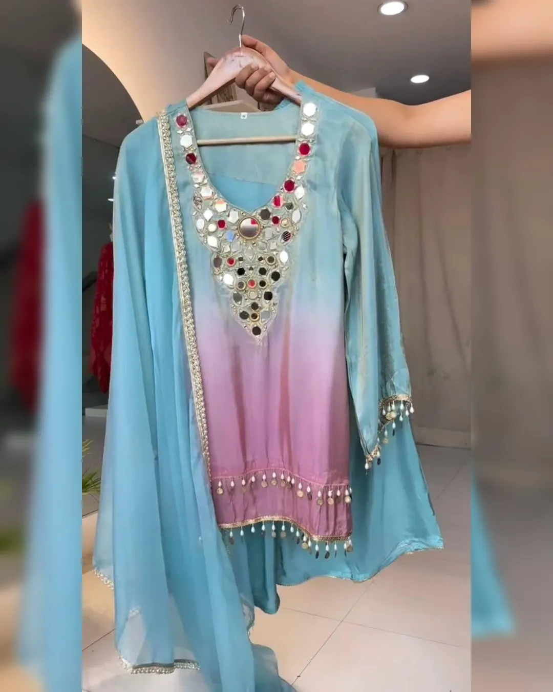 Step into effortless elegance with this exclusive 3-piece plazzo set, designed to blend comfort with festive charm. Crafted in premium printed crepe silk, the set features a beautifully embroidered and mirror-work top paired with a flowy plazzo and a soft printed organza dupatta. Perfect for festive occasions, casual celebrations, and elegant day wear, this outfit offers a flattering fit with a lightweight feel, making it a must-have addition to your ethnic wardrobe.