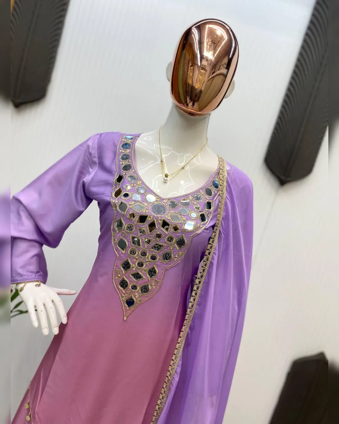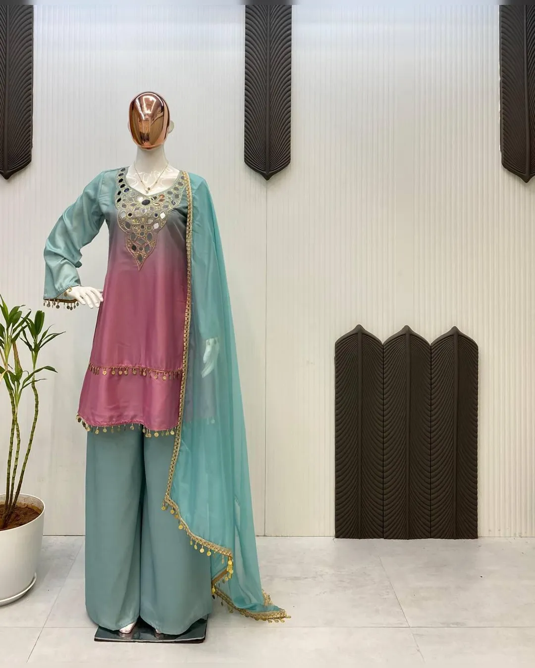 Elegant printed crepe silk top–plazzo set with mirror embroidery and soft organza dupatta, perfect for festive and casual occasions.