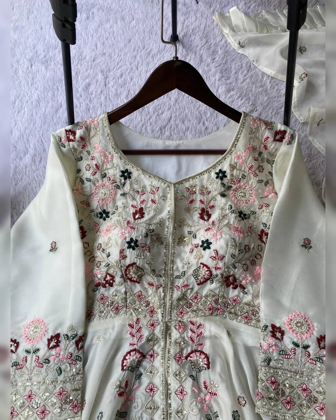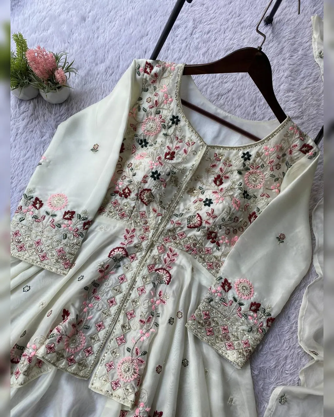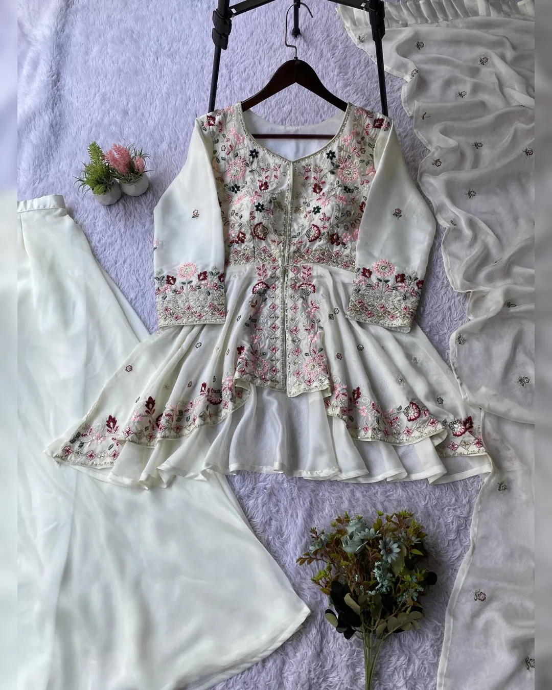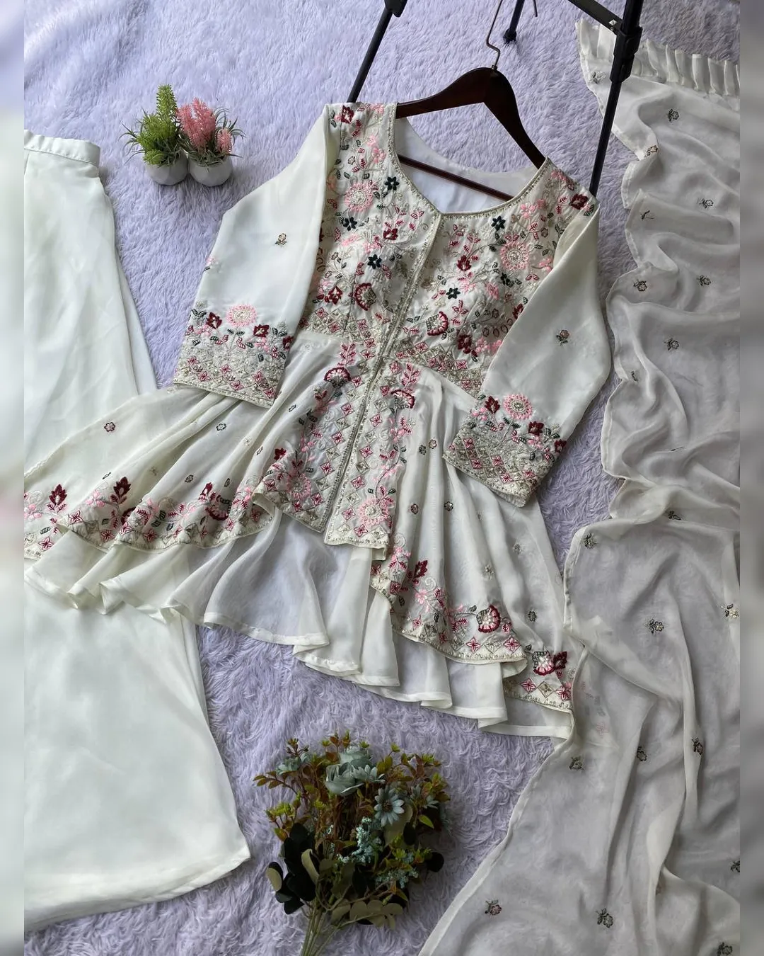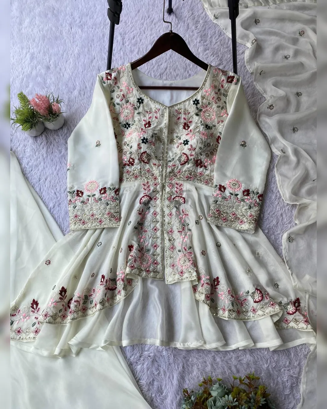 Elegant wedding-season Top-Plazzo-Dupatta set in Rangoli Silk with sequins embroidery. Fully stitched, festive-ready, and effortlessly stylish.