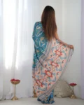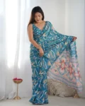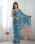 Make a statement at your next festive gathering or wedding with this Heavy Chinnon Saree, featuring vibrant all-over print work enhanced by a stunning Kutchi-style mirror lace border. The rich chinnon fabric offers a graceful drape and luxurious feel, while the included matching blouse piece lets you create the perfect custom fit.