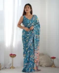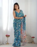 Vibrant heavy chinnon saree with printed design and mirror lace border, accompanied by a matching blouse piece for bespoke styling.