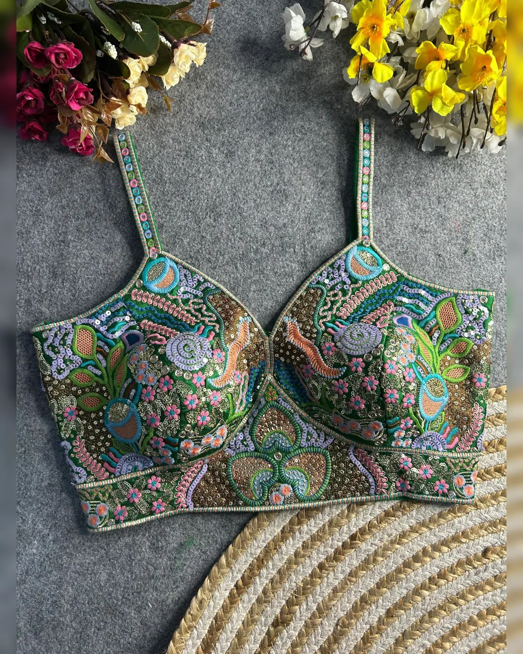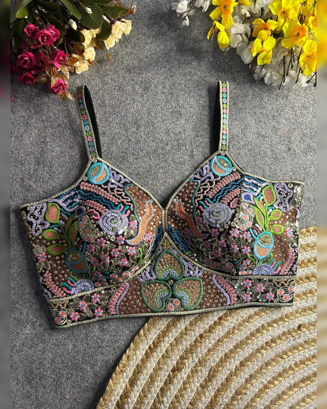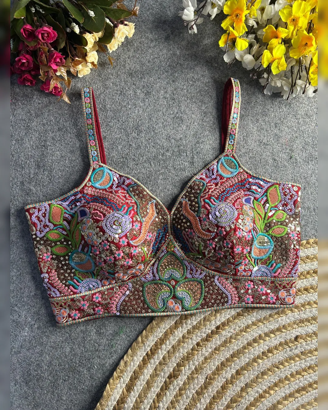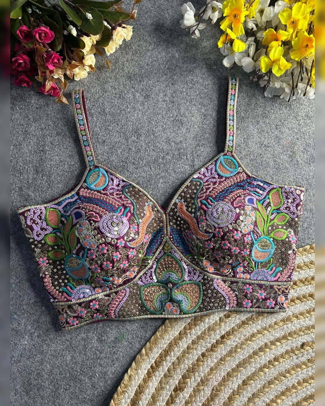 Step into elegance with this sleeveless designer blouse crafted from premium Heavy Italian Silk, tailored for women who love statement ethnic pieces. Featuring exquisite embroidery and shimmering sequin work, this blouse is a true blend of tradition and glam.