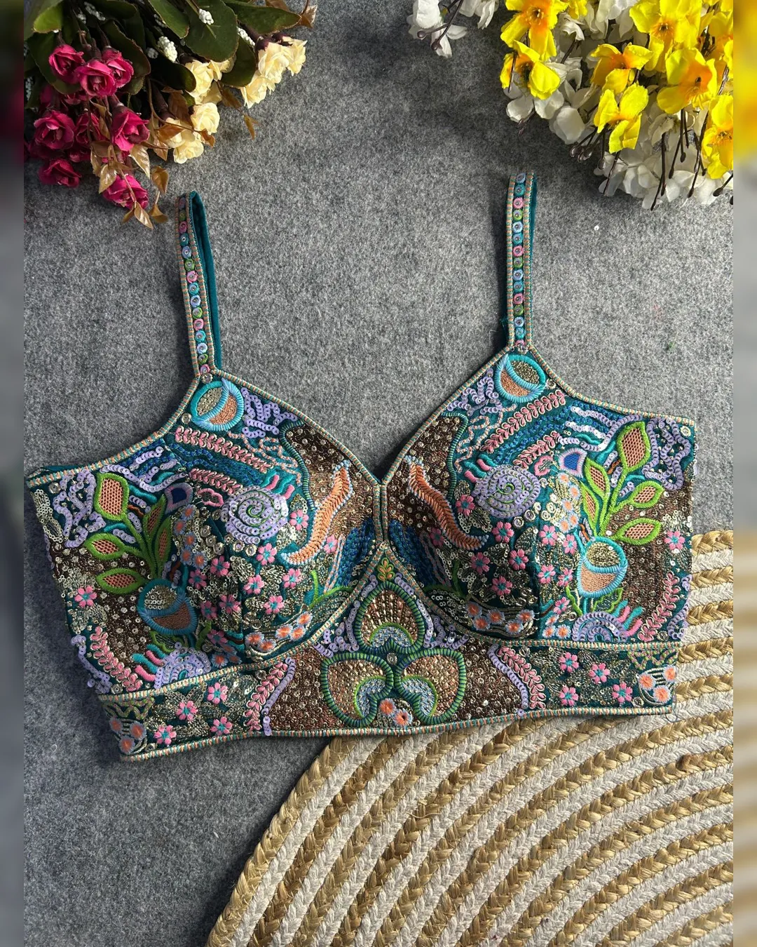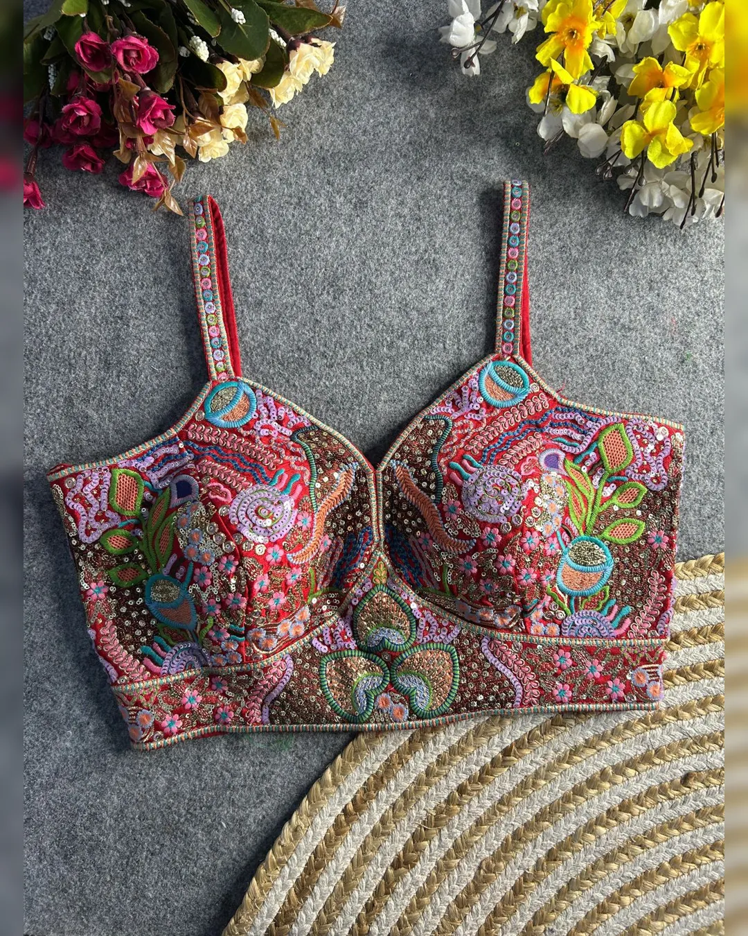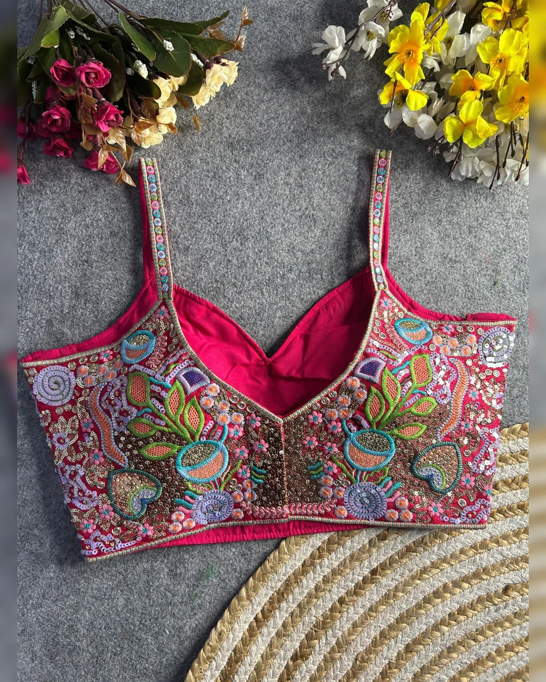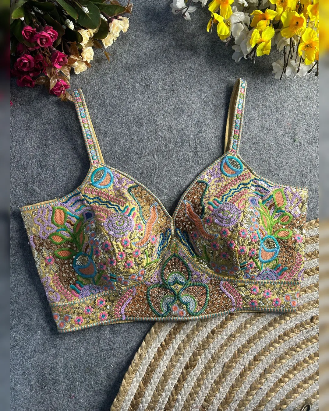Step into elegance with this sleeveless designer blouse crafted from premium Heavy Italian Silk, tailored for women who love statement ethnic pieces. Featuring exquisite embroidery and shimmering sequin work, this blouse is a true blend of tradition and glam.