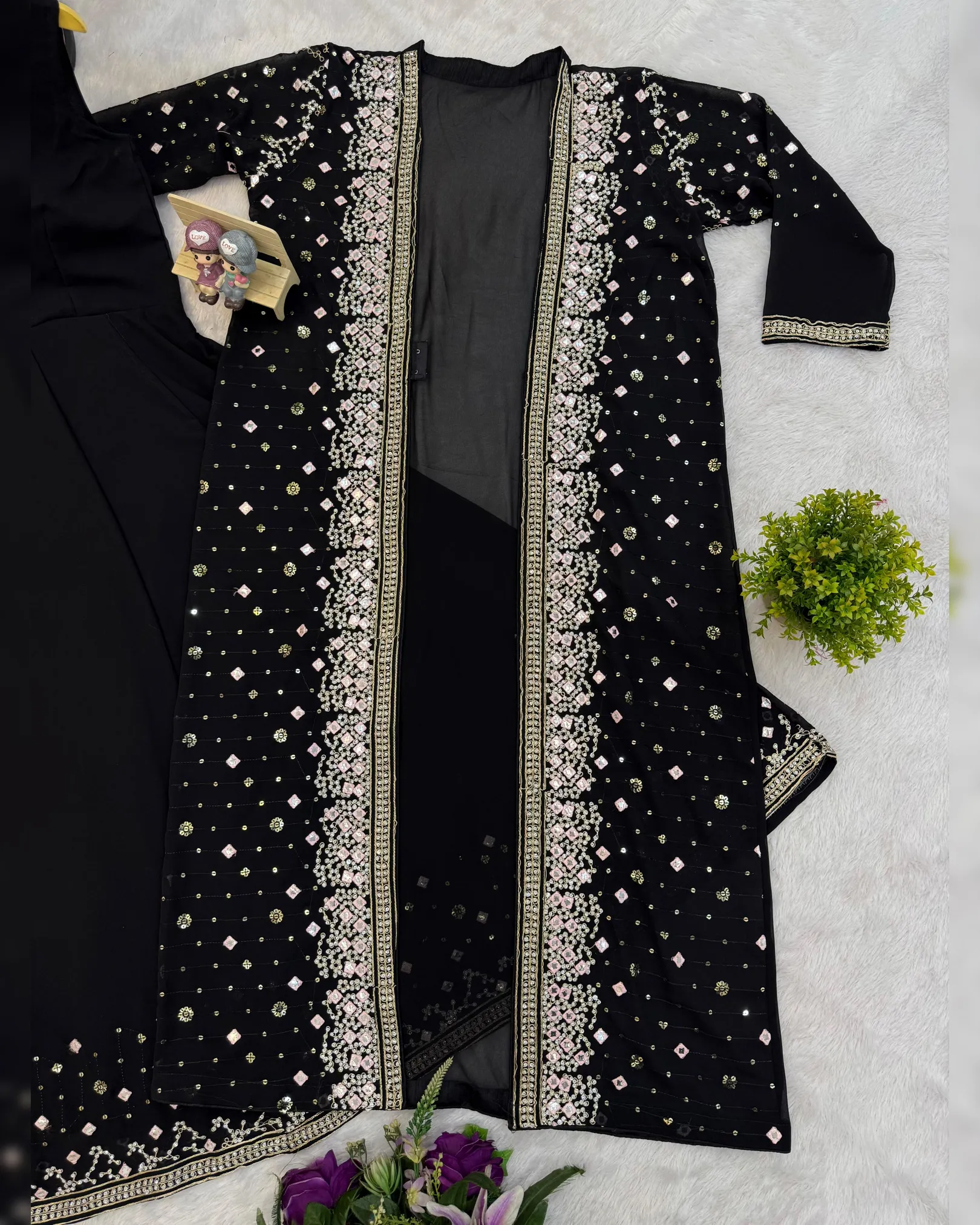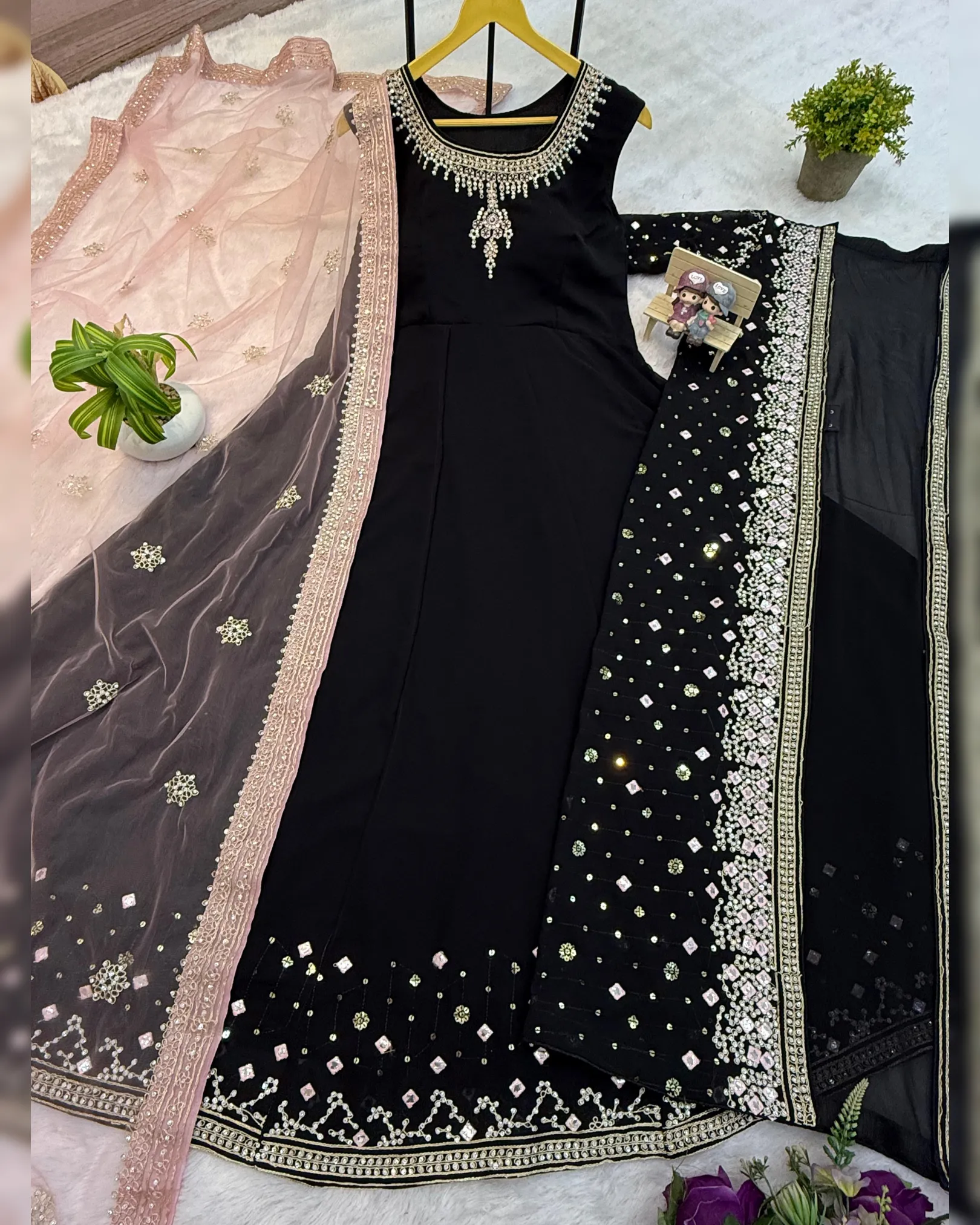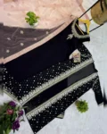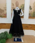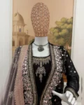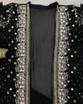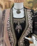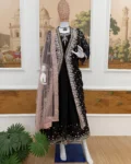 This 3-piece designer ensemble features a luxurious Faux Georgette Gown, paired with a heavily embellished embroidered koti, and a graceful net dupatta, all adorned with crystal diamond work that adds the perfect festive sparkle.