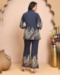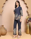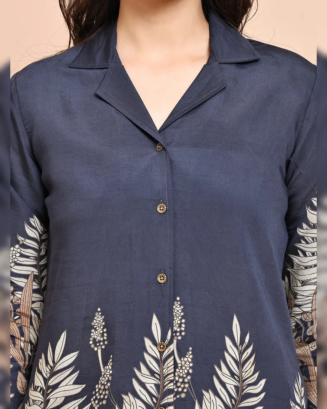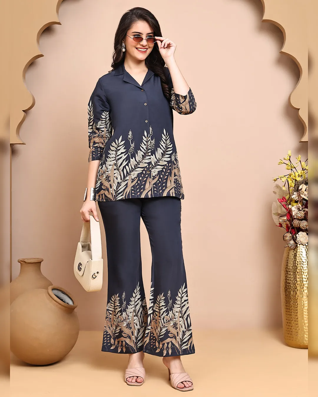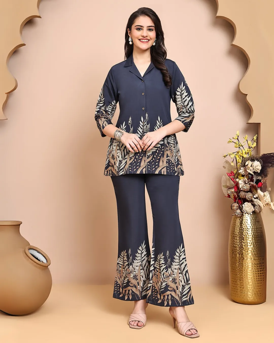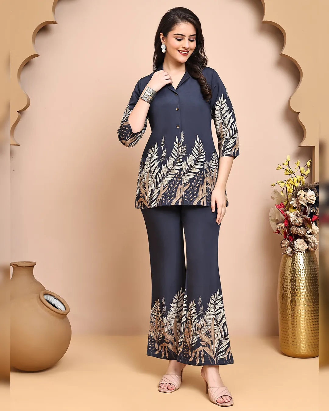 Grey floral printed co-ord set in Chanderi silk, with a shirt-collar top and matching trousers—comfortable, classy, and effortlessly stylish.