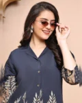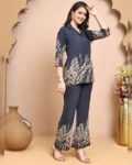 Crafted in premium Chanderi silk, this grey floral printed co-ord set is a blend of elegance and ease. Featuring a classic shirt-style top with a shirt collar, three-quarter sleeves, and a button-down front, it's paired with matching trousers designed with an elasticated drawstring waistband for a snug yet relaxed fit. Perfect for casual outings, festive brunches, or elevated everyday wear.