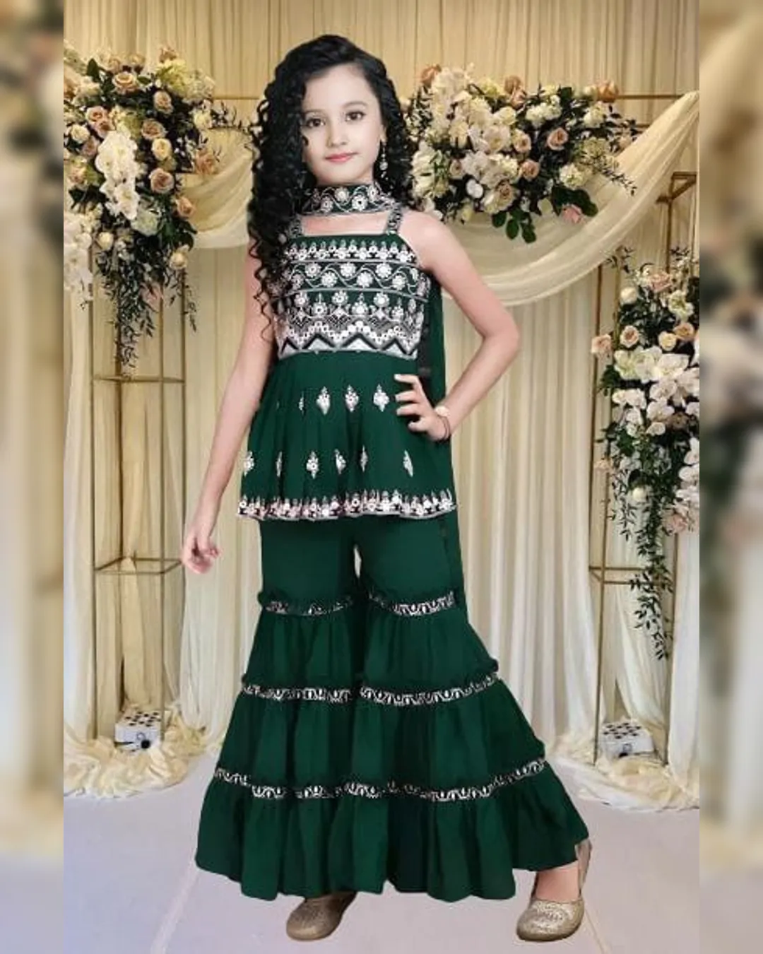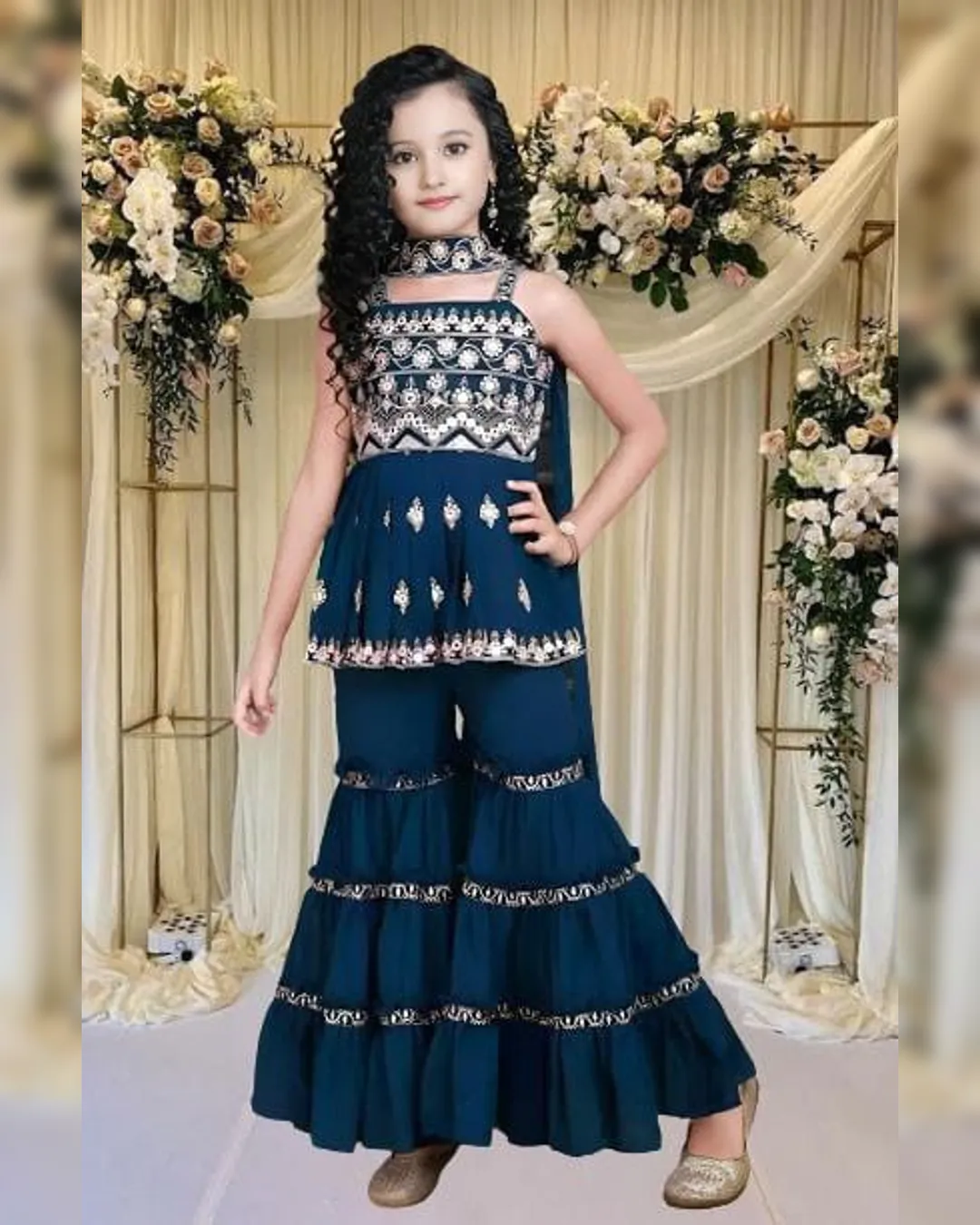 Add a touch of elegance and charm to your little one's festive wardrobe with our girls embroidered kurta sharara set. Designed for comfort and style, this sleeveless outfit is perfect for celebrations, family functions, or festive parties. The set includes a beautifully embroidered poly crepe kurta, matching sharara, and a coordinating dupatta crafted in crepe with embroidery work. Light, breathable, and effortlessly stylish — it’s the perfect festive ensemble for young fashionistas.