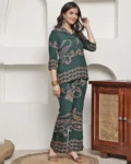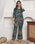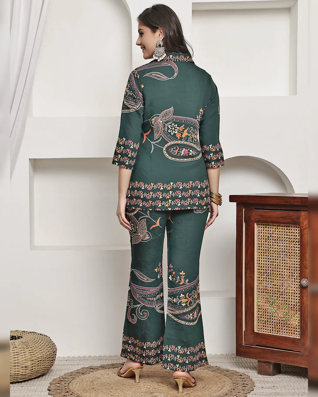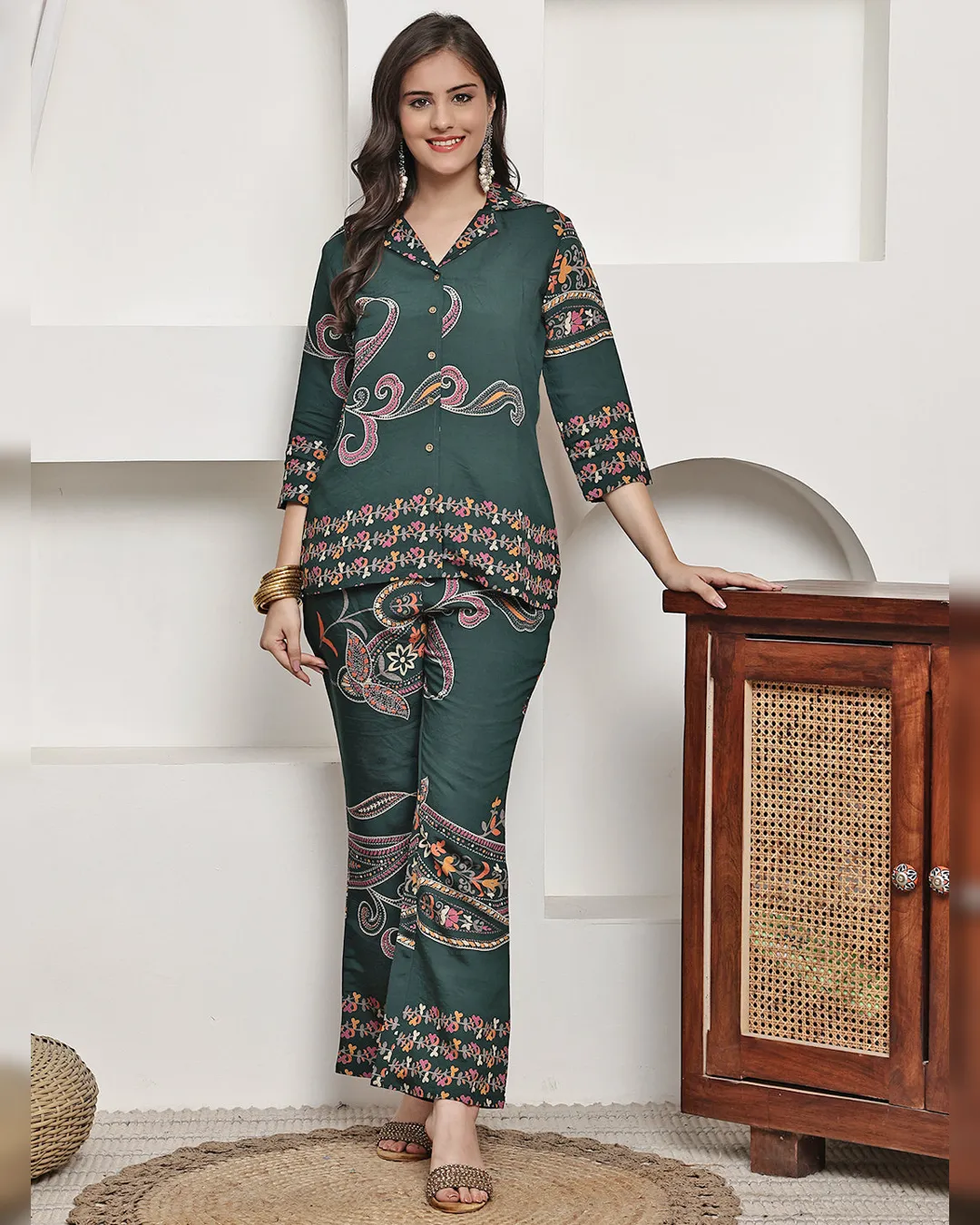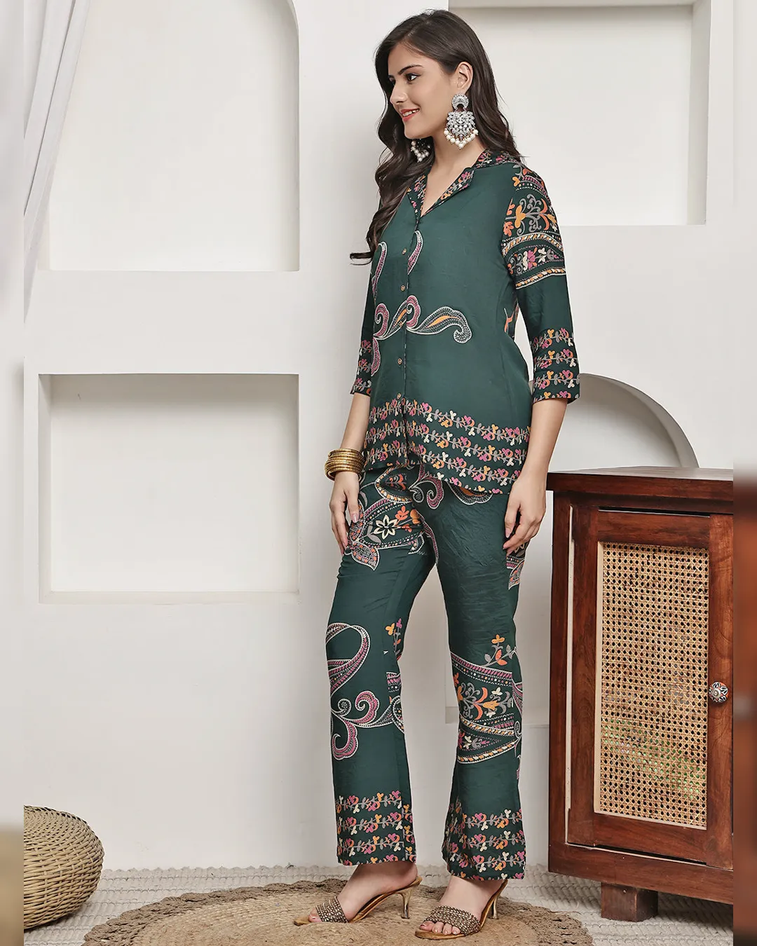 Abstract printed green Chanderi silk co-ord set with a shirt-collar top and easy-fit elasticated trousers—elevate your everyday effortlessly.