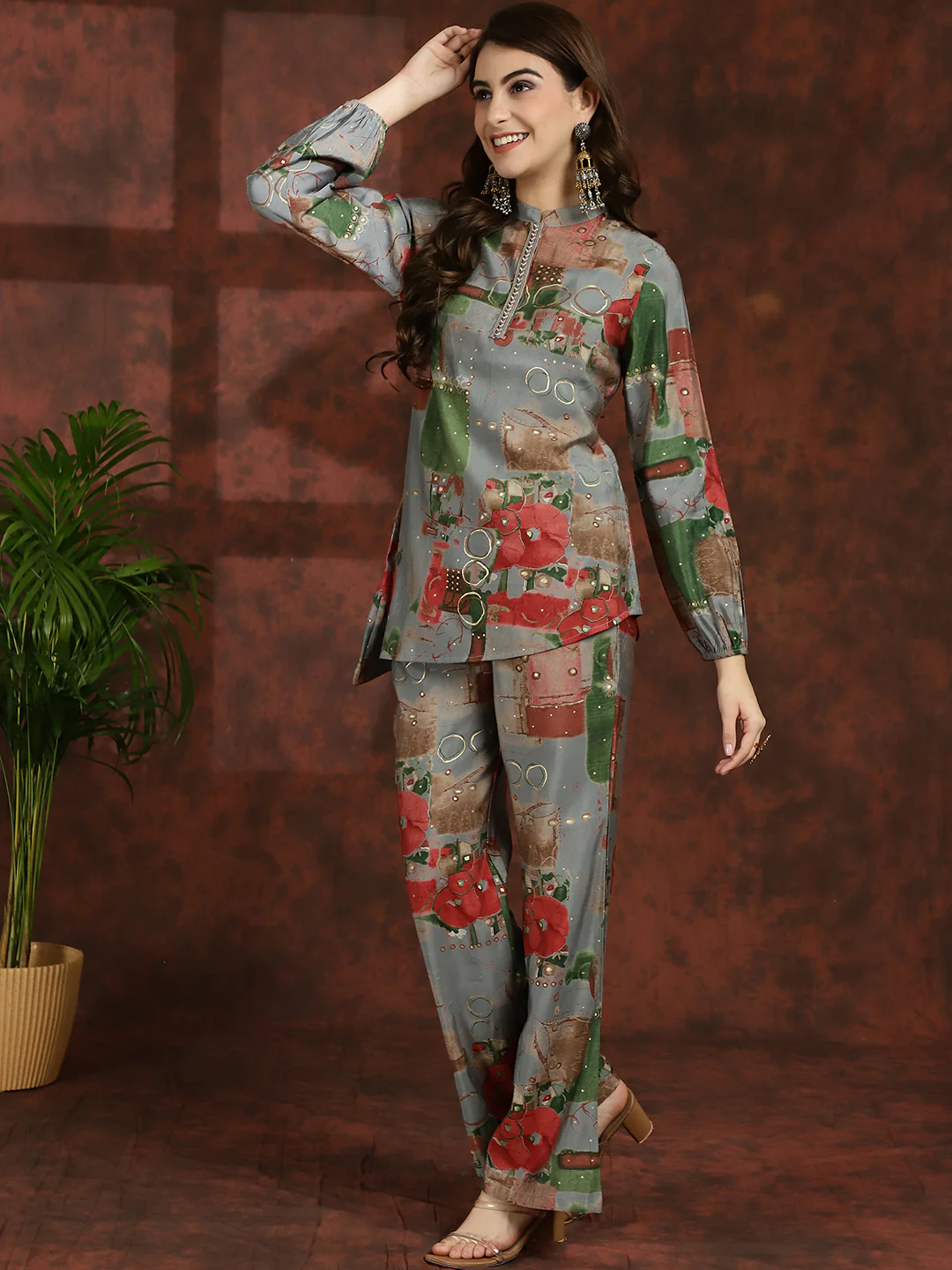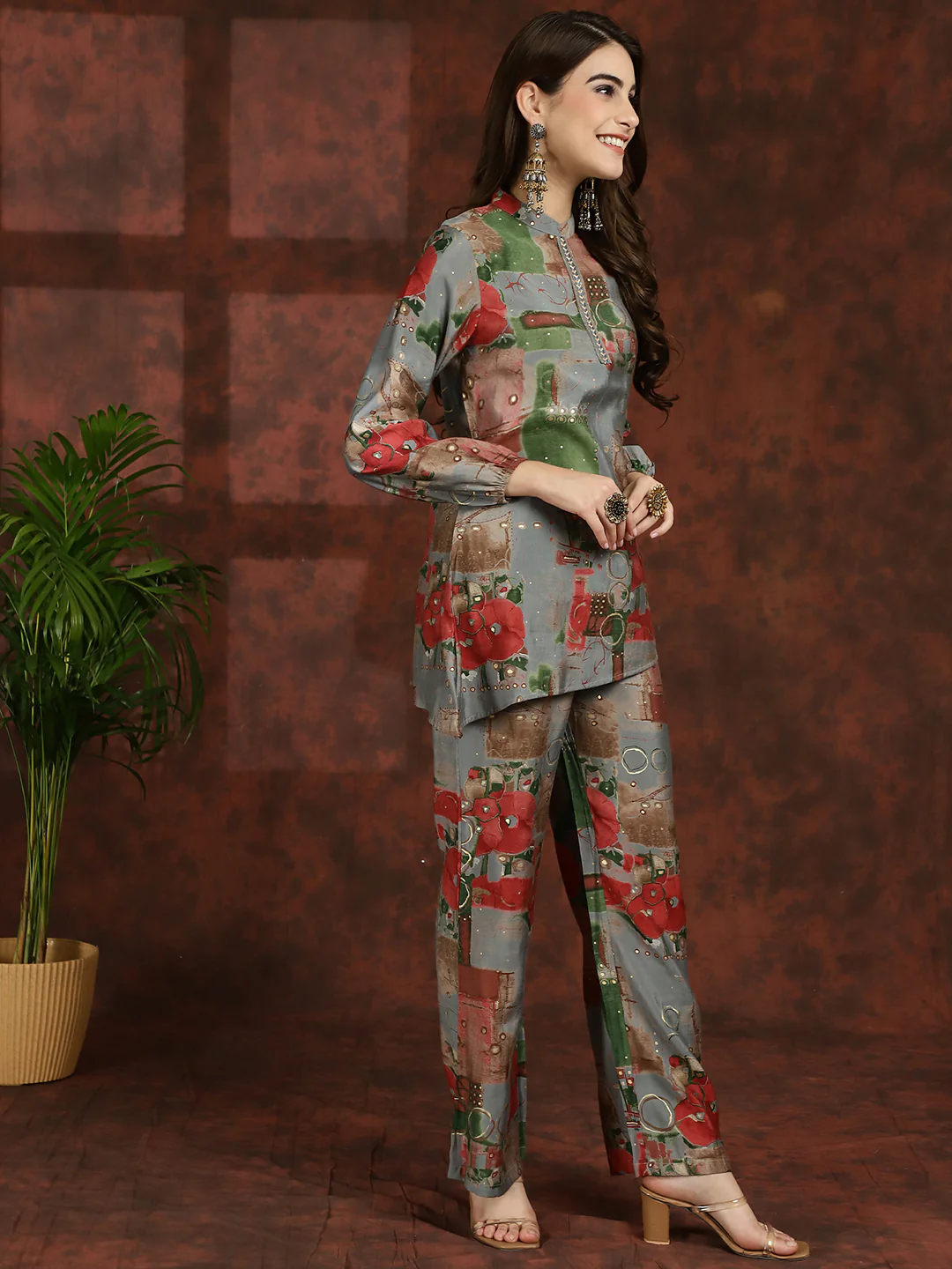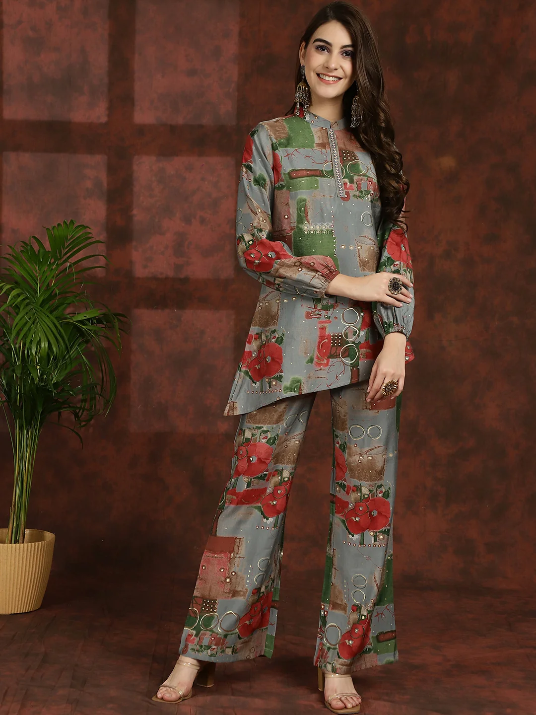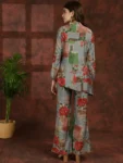 Embrace the elegance of tradition with our Grey Blossom Ensemble, a graceful co-ord set designed to elevate your ethnic wardrobe effortlessly. Crafted from exquisite Chanderi Silk fabric, this set features a Grey Floral Printed Tunic paired with matching Mid-Rise Palazzos, perfect for ethnic occasions. The tunic showcases a sophisticated Mandarin Collar, Long Sleeves, and a hook closure, exuding timeless charm and sophistication. Complementing the tunic, the palazzos offer a comfortable fit with a slip-on closure and a flattering flared hem, ensuring both style and comfort. Adorned with delicate floral prints in shades of grey, this ensemble radiates understated elegance and traditional allure. Whether you're attending a festive celebration or a cultural event, the Grey Blossom Ensemble will ensure you stand out with effortless grace and style.