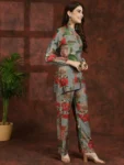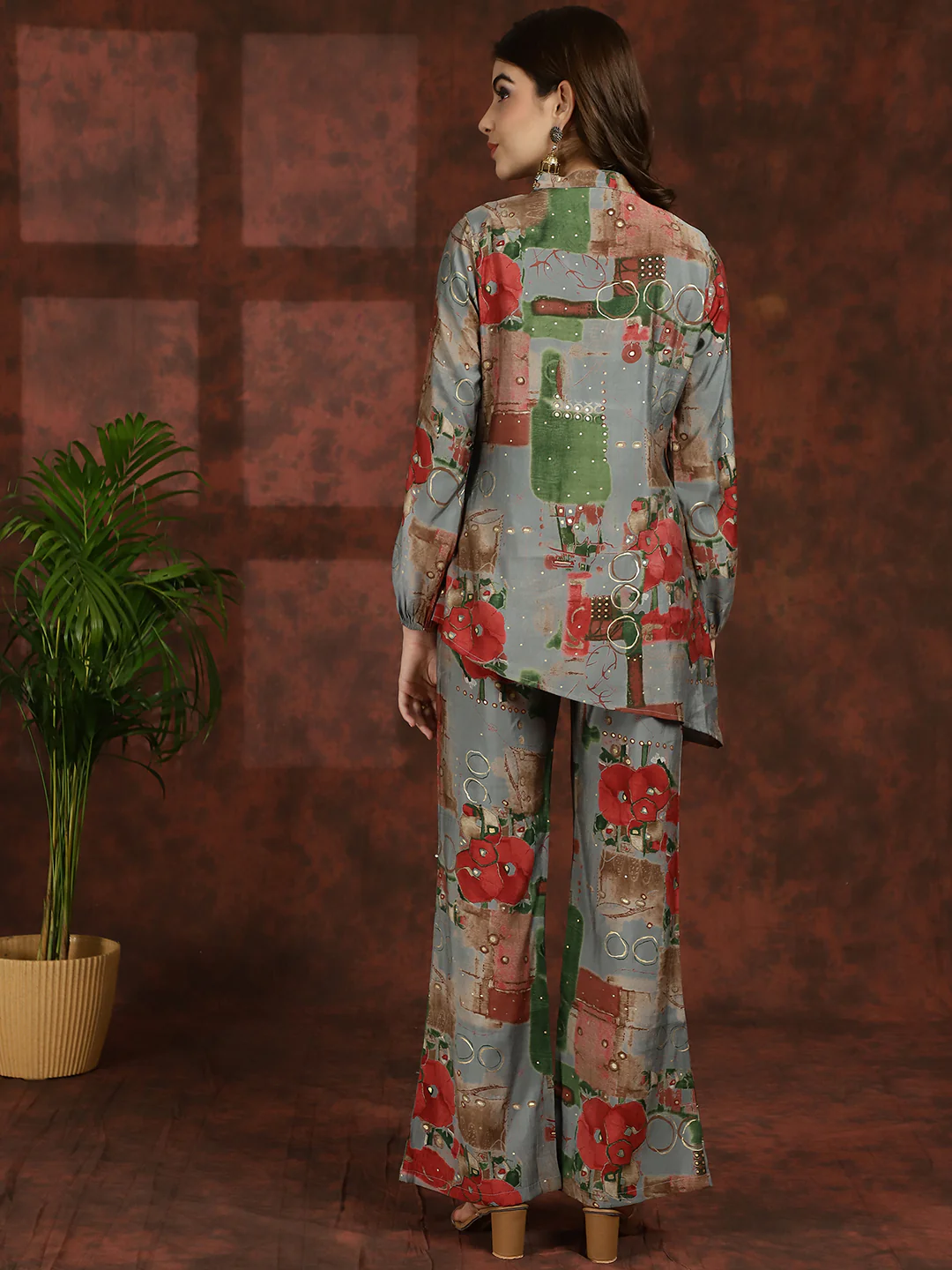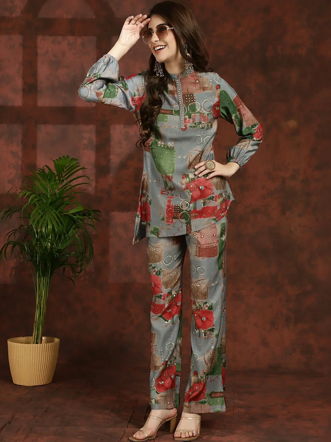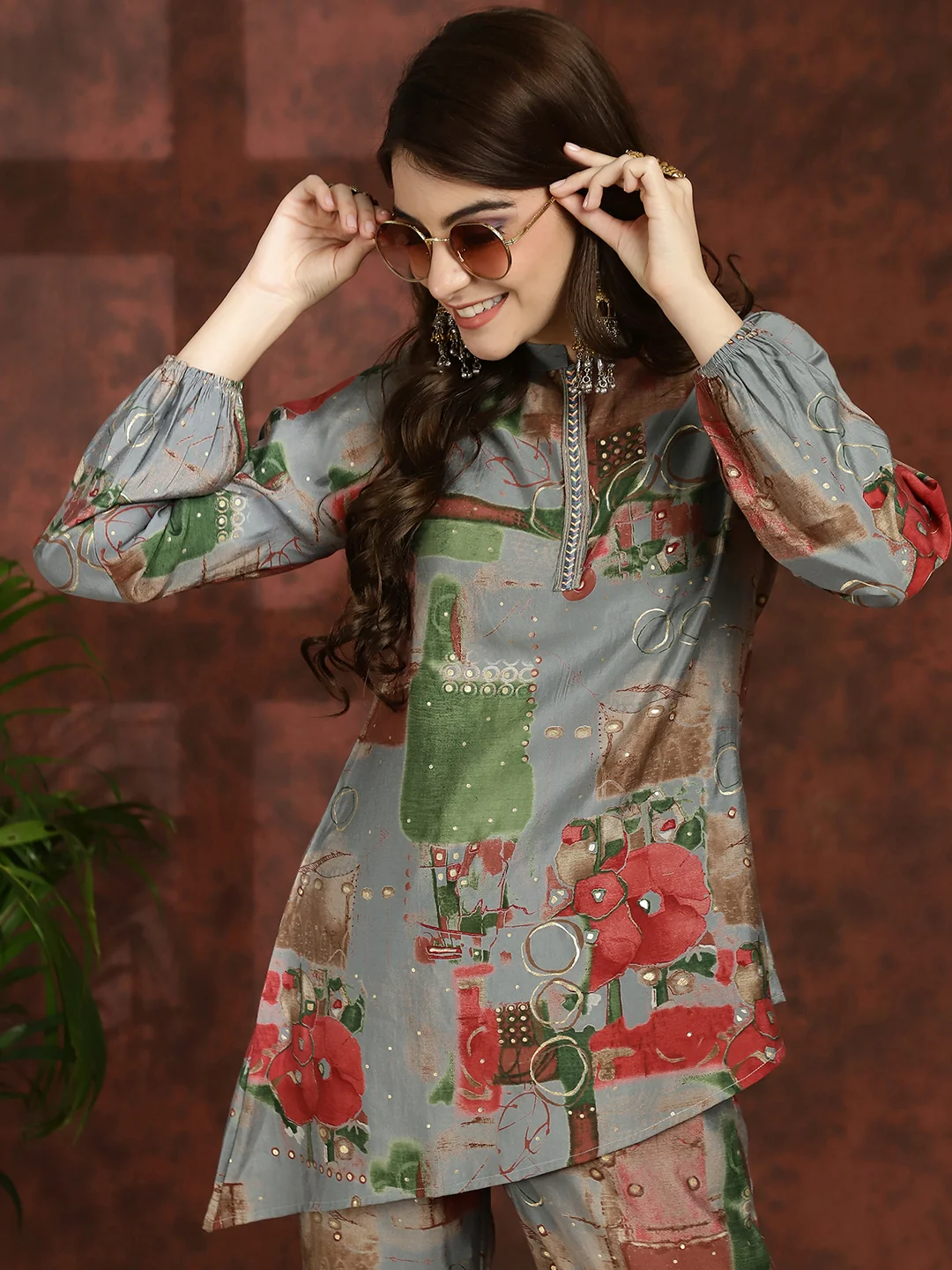 Embrace the elegance of tradition with our Grey Blossom Ensemble, a graceful co-ord set designed to elevate your ethnic wardrobe effortlessly. Crafted from exquisite Chanderi Silk fabric, this set features a Grey Floral Printed Tunic paired with matching Mid-Rise Palazzos, perfect for ethnic occasions. The tunic showcases a sophisticated Mandarin Collar, Long Sleeves, and a hook closure, exuding timeless charm and sophistication. Complementing the tunic, the palazzos offer a comfortable fit with a slip-on closure and a flattering flared hem, ensuring both style and comfort. Adorned with delicate floral prints in shades of grey, this ensemble radiates understated elegance and traditional allure. Whether you're attending a festive celebration or a cultural event, the Grey Blossom Ensemble will ensure you stand out with effortless grace and style.