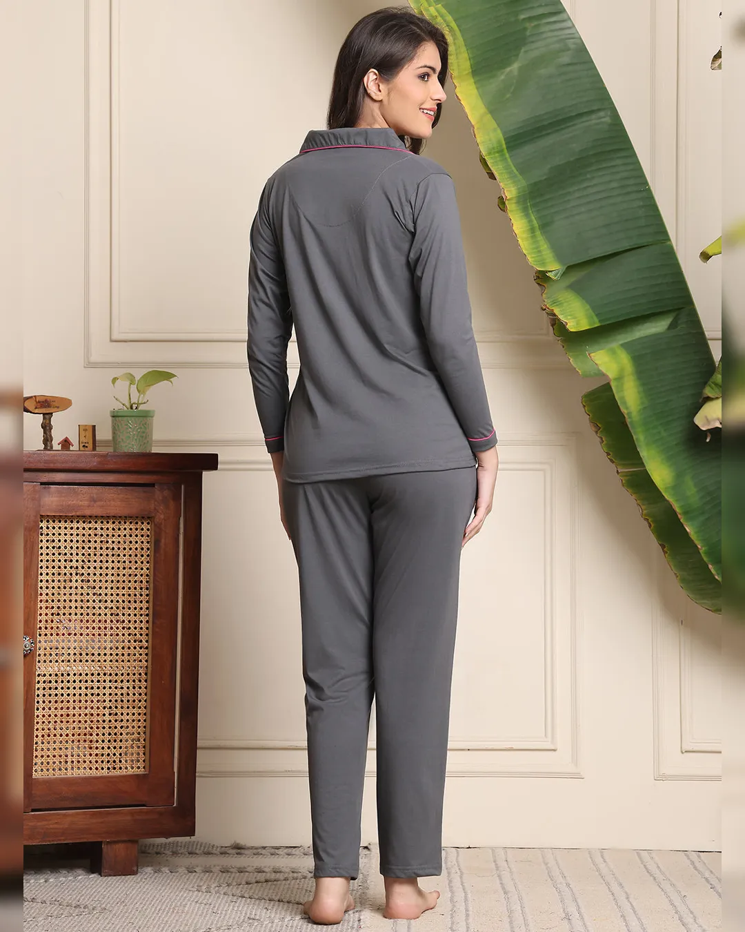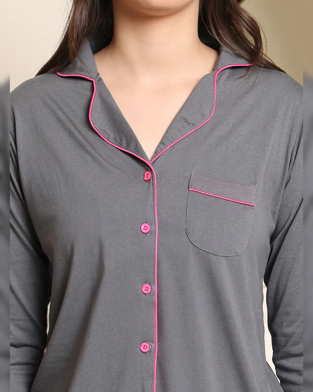 Sleep in style and comfort with this grey solid printed cotton night suit, featuring a shirt collar, 3/4 sleeves, and breathable cotton fabric.