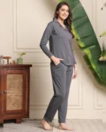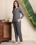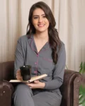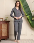 Unwind in style with the Grey Solid Printed Cotton Night Suit for Women, thoughtfully crafted for those who value both comfort and contemporary fashion. Made from premium-quality pure cotton, this set is exceptionally soft, breathable, and gentle on the skin. The sleek grey solid print adds a modern, minimalist charm to your loungewear collection. The top features a shirt collar, 3/4 sleeves, and a button-down front, offering both function and flair. Paired with matching bottoms tailored for a relaxed fit, this set is perfect for sleep, lounging, or casual indoor wear.