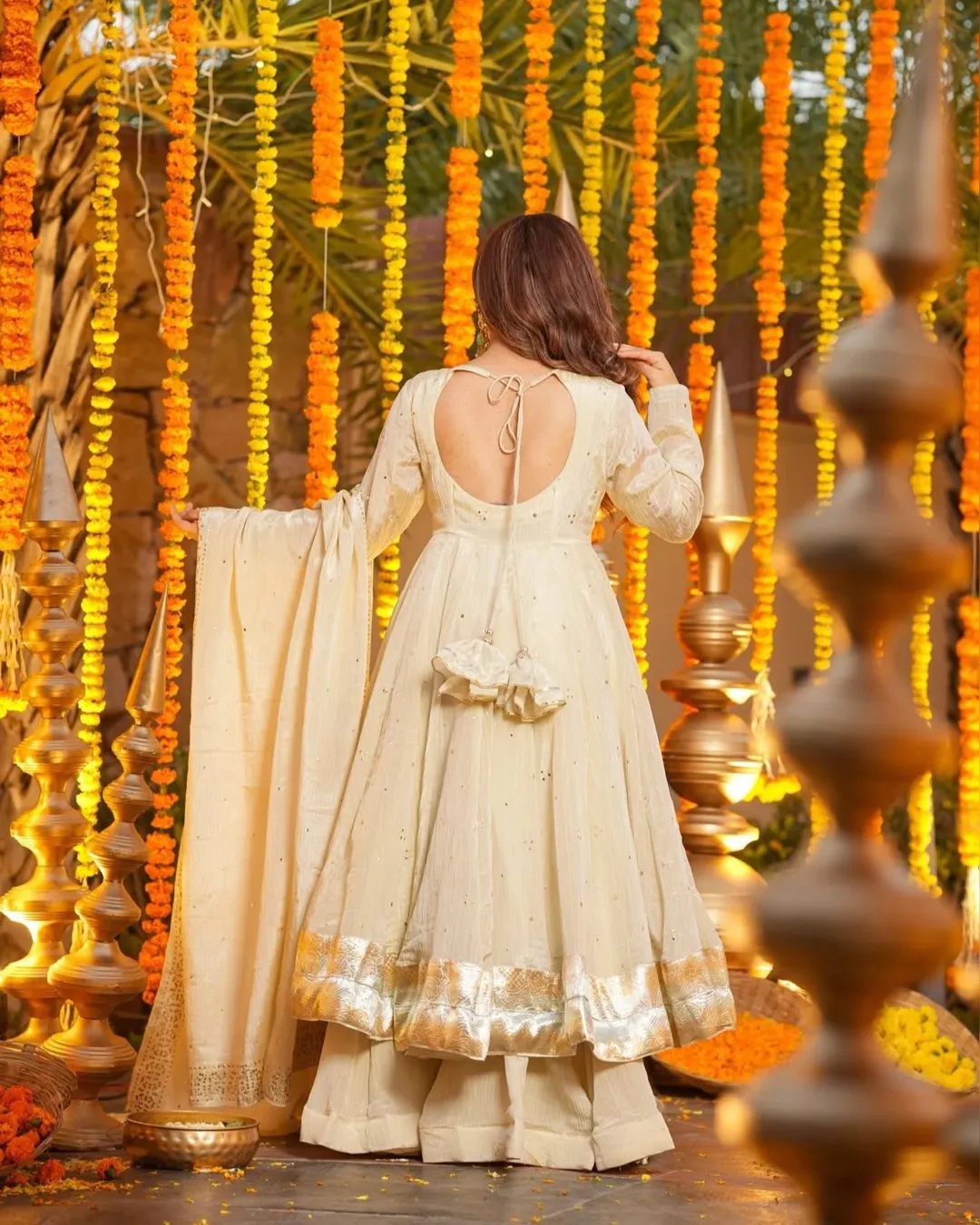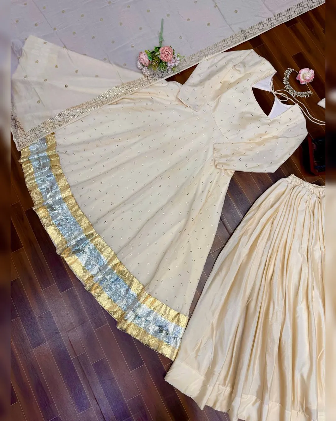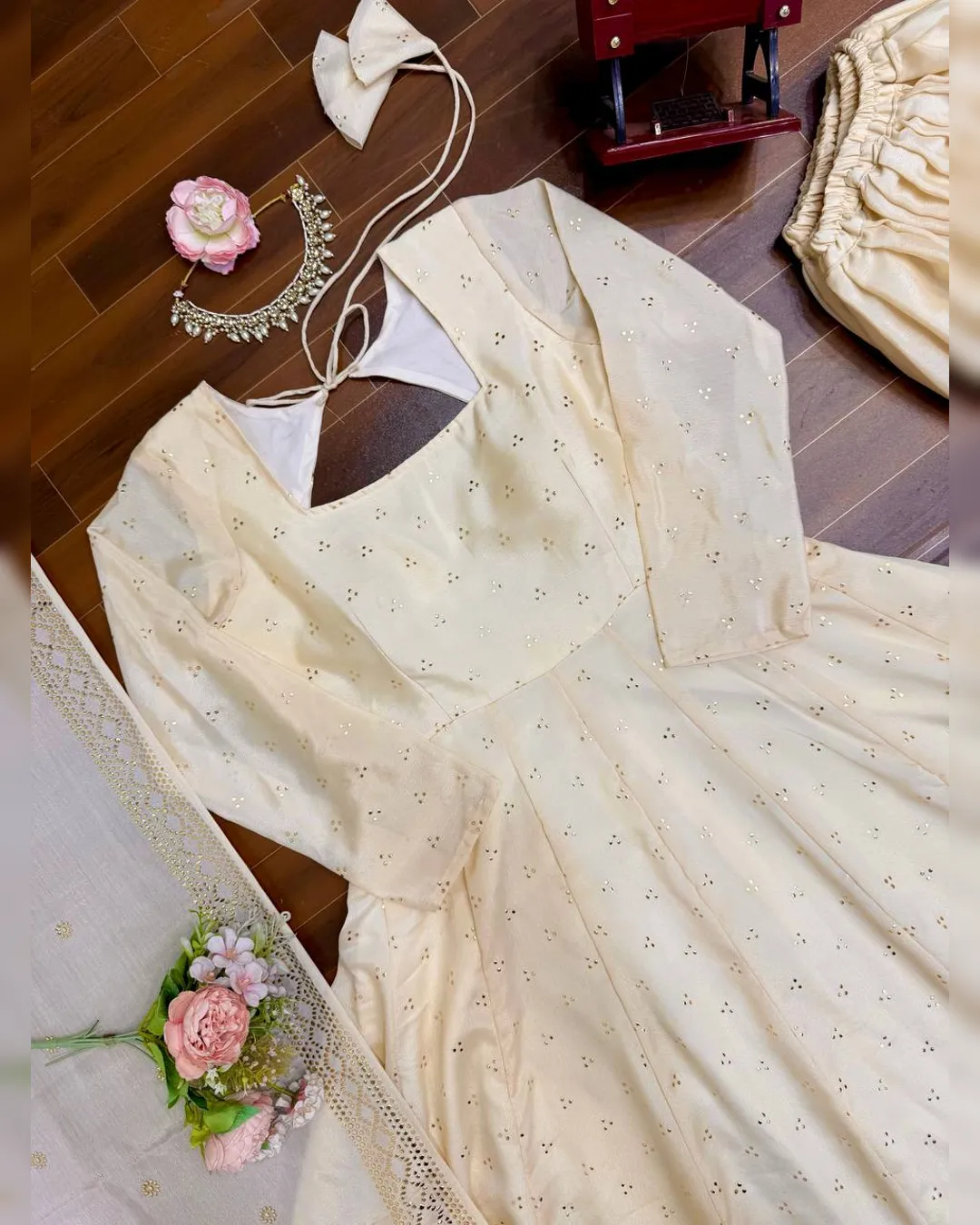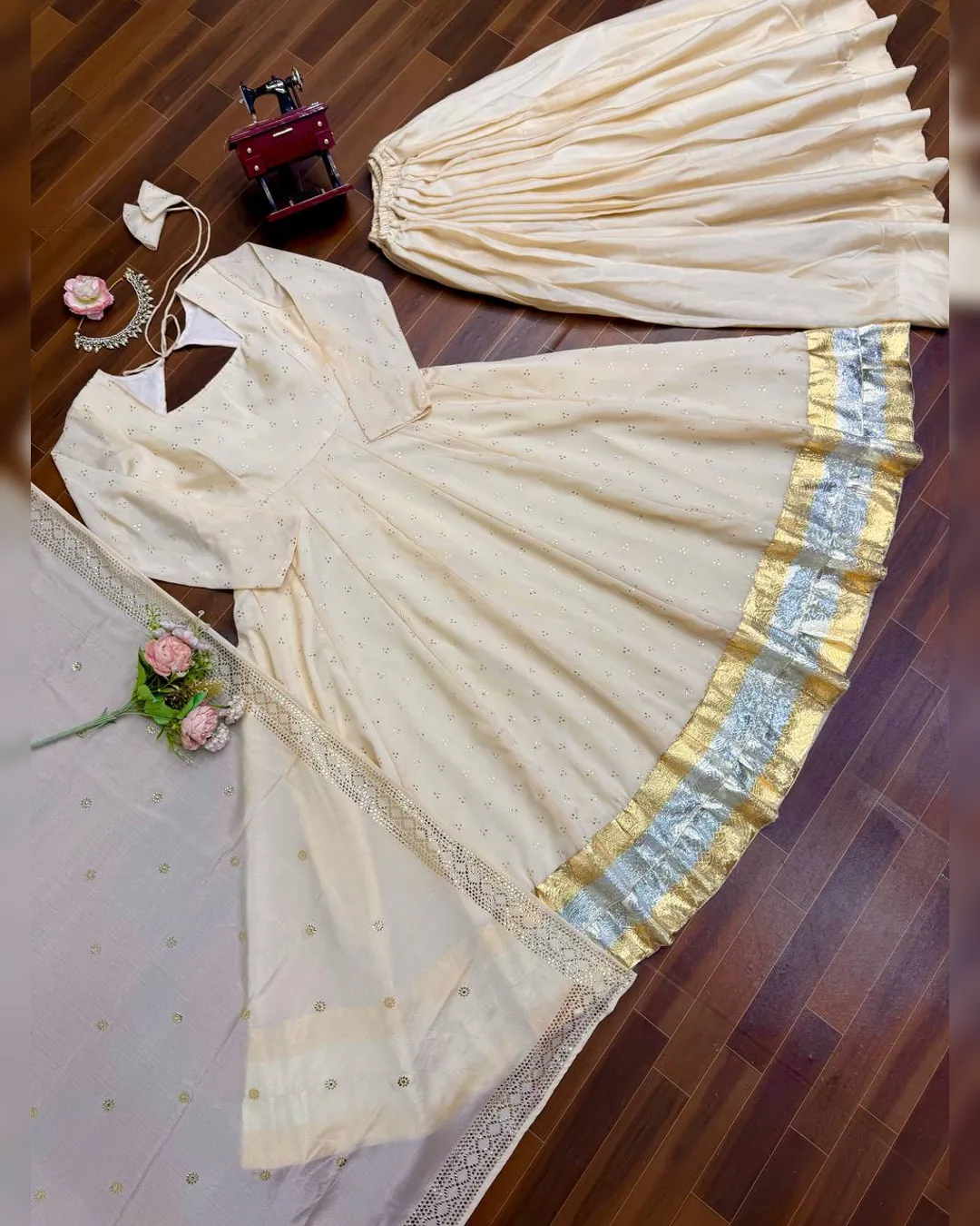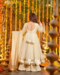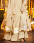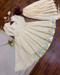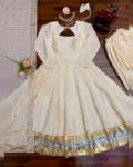 Make a graceful statement at weddings, festive celebrations, and elegant occasions with this stunning 3-piece Gown, Plazzo, and Dupatta set. Crafted from luxurious heavy Chinnon silk, the outfit features exquisite Mukesh work enhanced with a classy Lagadi Patto, giving it a rich traditional appeal. The fully flared gown paired with a comfortable stitched plazzo and matching dupatta ensures both elegance and ease of wear. Designed with soft micro cotton lining for all-day comfort, this ensemble is perfect for celebrations that demand timeless style and premium craftsmanship.