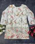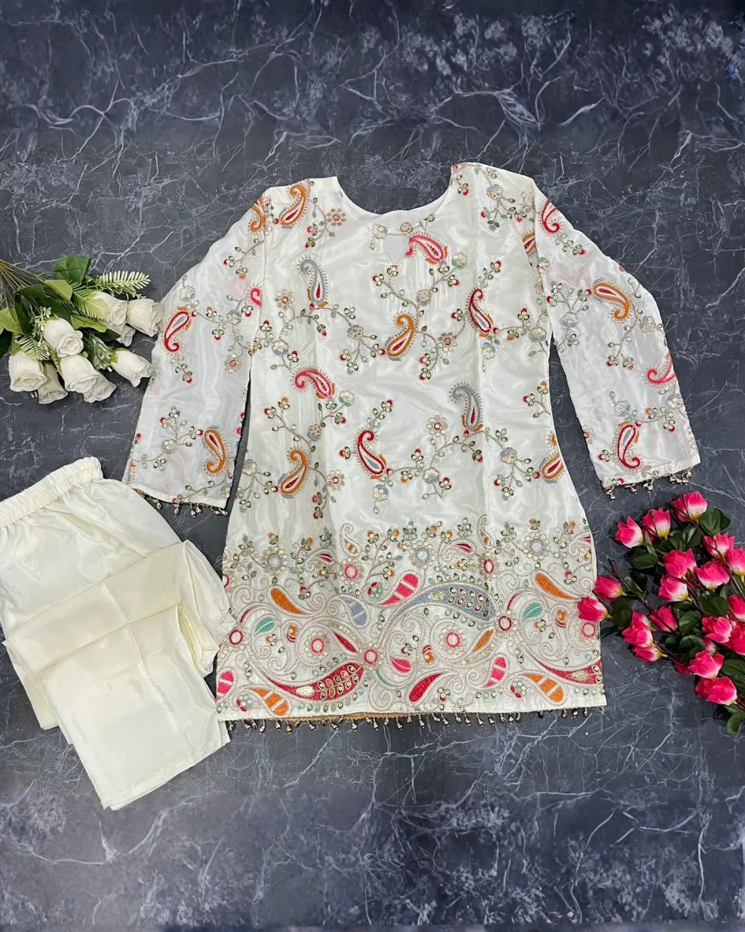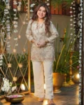 The kurta is adorned with intricate embroidery work, enhancing its sophisticated appeal. Paired with a matching crepe silk pant, this set creates a polished and graceful look.