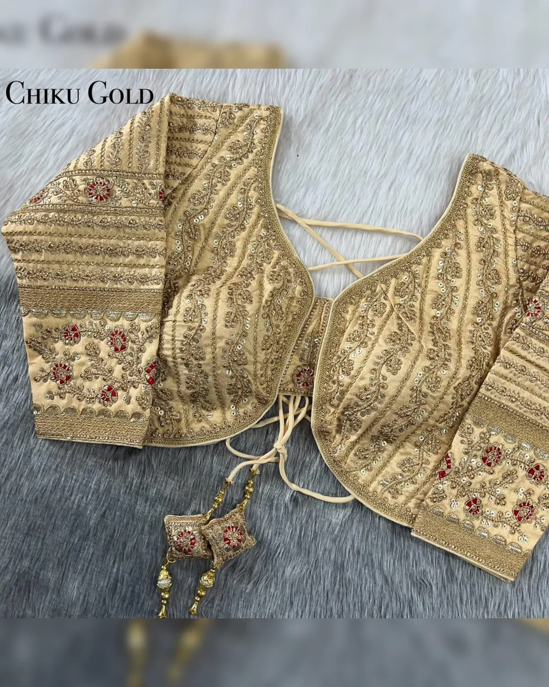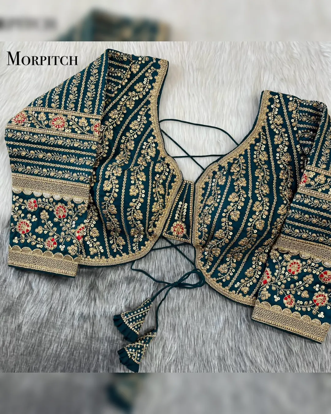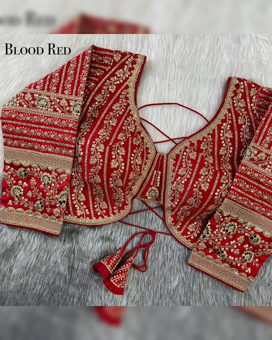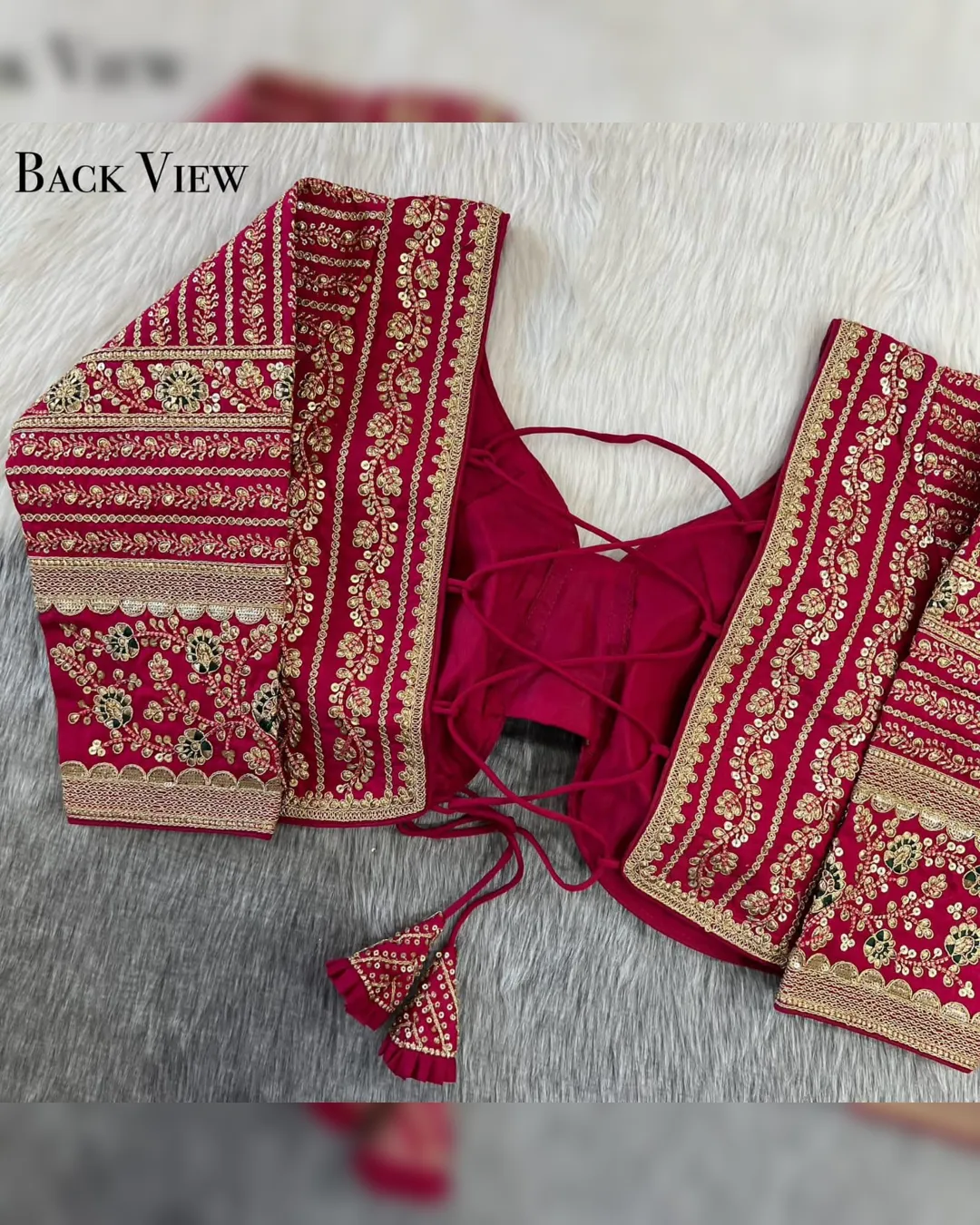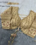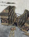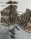 Make a grand statement on your special day with this luxurious backless bridal blouse featuring heavy embroidery work on premium Timo silk fabric. Designed for a perfect bridal look, this blouse comes with stunning 21-inch long embroidered sleeves, soft padding for comfort, and a back-open doori style with matching latkans. A perfect blend of tradition and elegance, this blouse is ideal for weddings, receptions, and grand festive occasions.