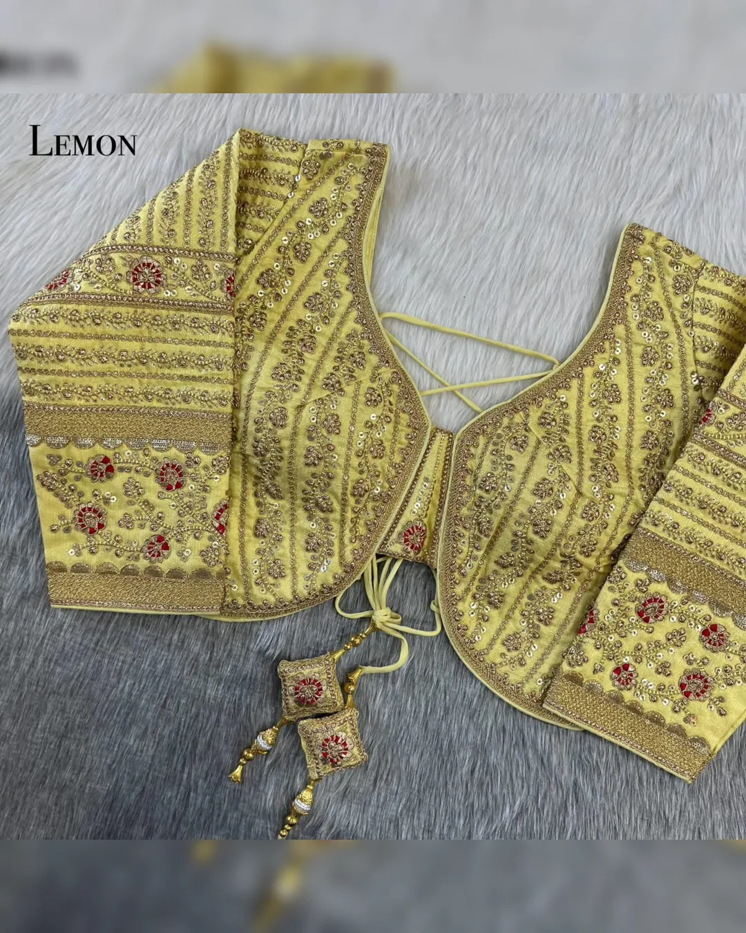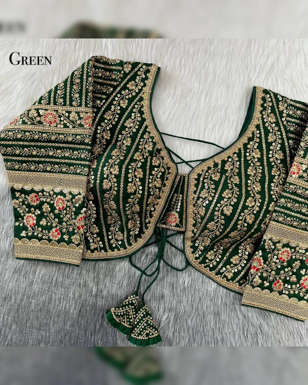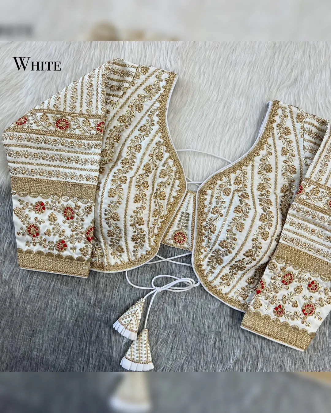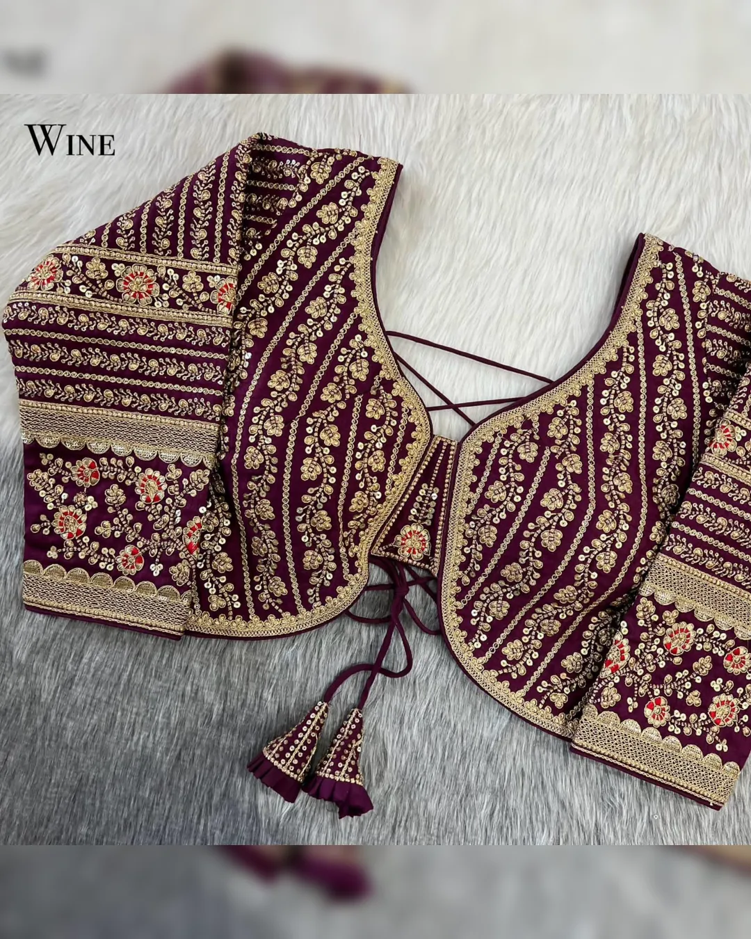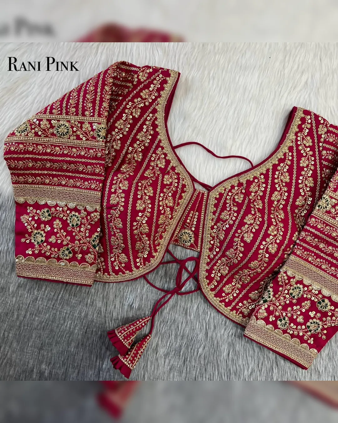 Make a grand statement on your special day with this luxurious backless bridal blouse featuring heavy embroidery work on premium Timo silk fabric. Designed for a perfect bridal look, this blouse comes with stunning 21-inch long embroidered sleeves, soft padding for comfort, and a back-open doori style with matching latkans. A perfect blend of tradition and elegance, this blouse is ideal for weddings, receptions, and grand festive occasions.