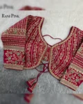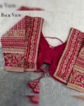 Exquisite bridal blouse with heavy embroidery, 21-inch long sleeves, and a stunning backless doori design—crafted from premium Timo silk for a regal wedding look.