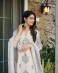 The set includes a matching bottom and a beautifully coordinated dupatta, completing the sophisticated 3-piece ensemble. Fully stitched and ready to wear, this outfit is available in a wide size range to suit all body types.