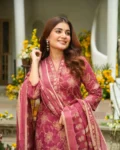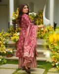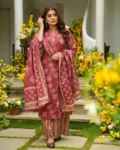 The set includes a matching bottom and a beautifully coordinated dupatta, completing the sophisticated 3-piece ensemble. Fully stitched and ready to wear, this outfit is available in a wide size range to suit all body types.