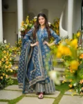 The set includes a matching bottom and a beautifully coordinated dupatta, completing the sophisticated 3-piece ensemble. Fully stitched and ready to wear, this outfit is available in a wide size range to suit all body types.
