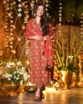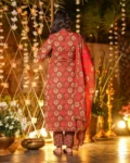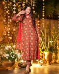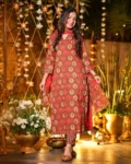The set includes a matching bottom and a beautifully coordinated dupatta, completing the sophisticated 3-piece ensemble. Fully stitched and ready to wear, this outfit is available in a wide size range to suit all body types.