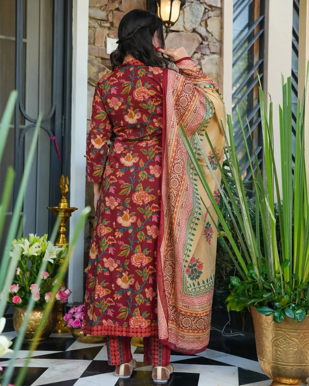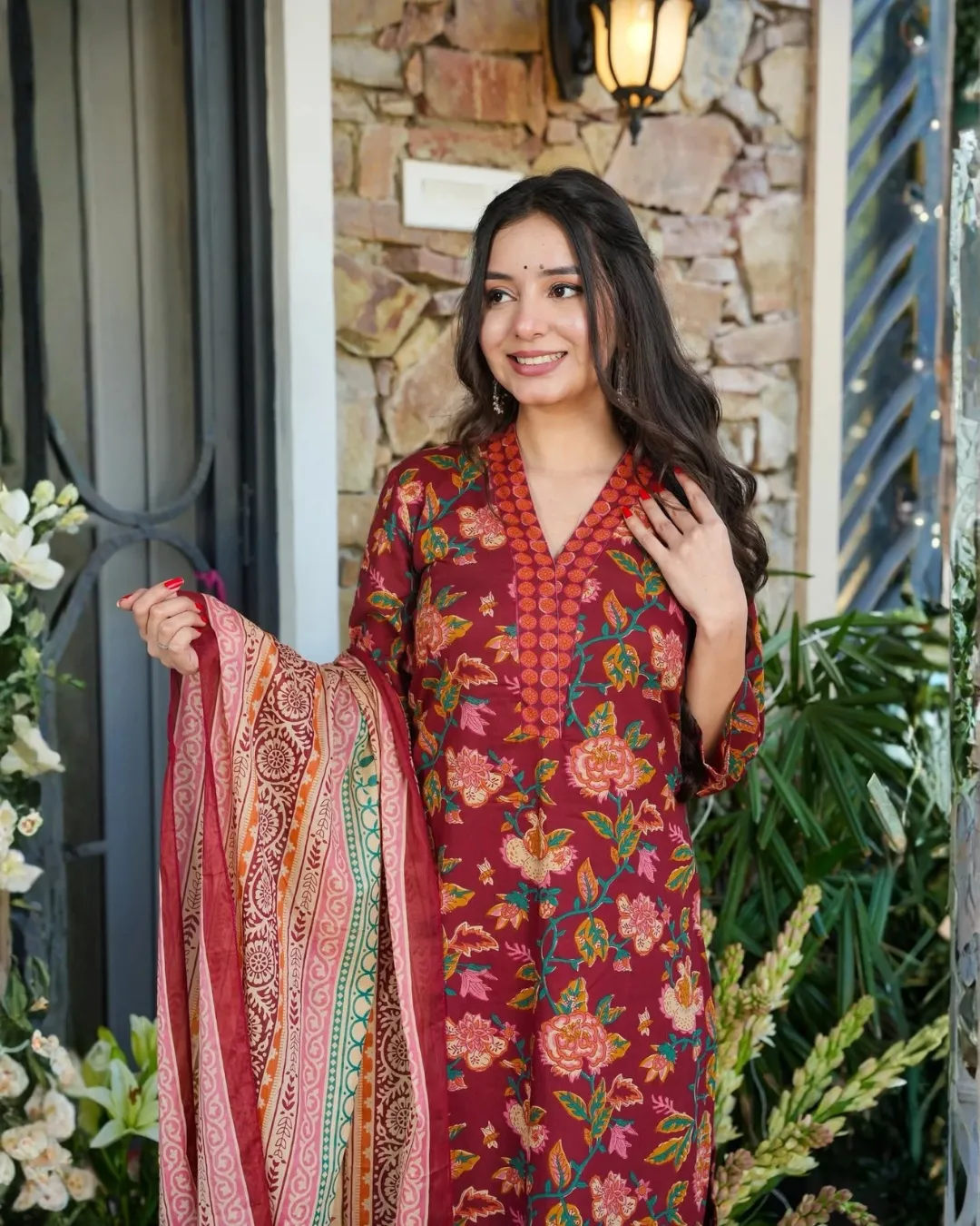 Enhance your everyday ethnic style with this beautiful straight-style Kurti, Bottom and Dupatta set, designed with elegant heavy digital prints for a graceful look. Made from premium heavy muslin fabric, the outfit provides both comfort and a rich appearance.