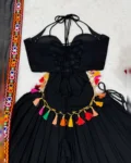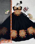 Navratri-ready heavy rayon lehenga choli set with real mirror, gamthi thread, and tassel work. Fully stitched with padded blouse and tassel-strap detailing. Grand 4.5-meter flair for a perfect festive twirl.
