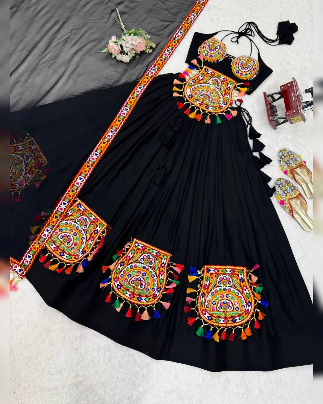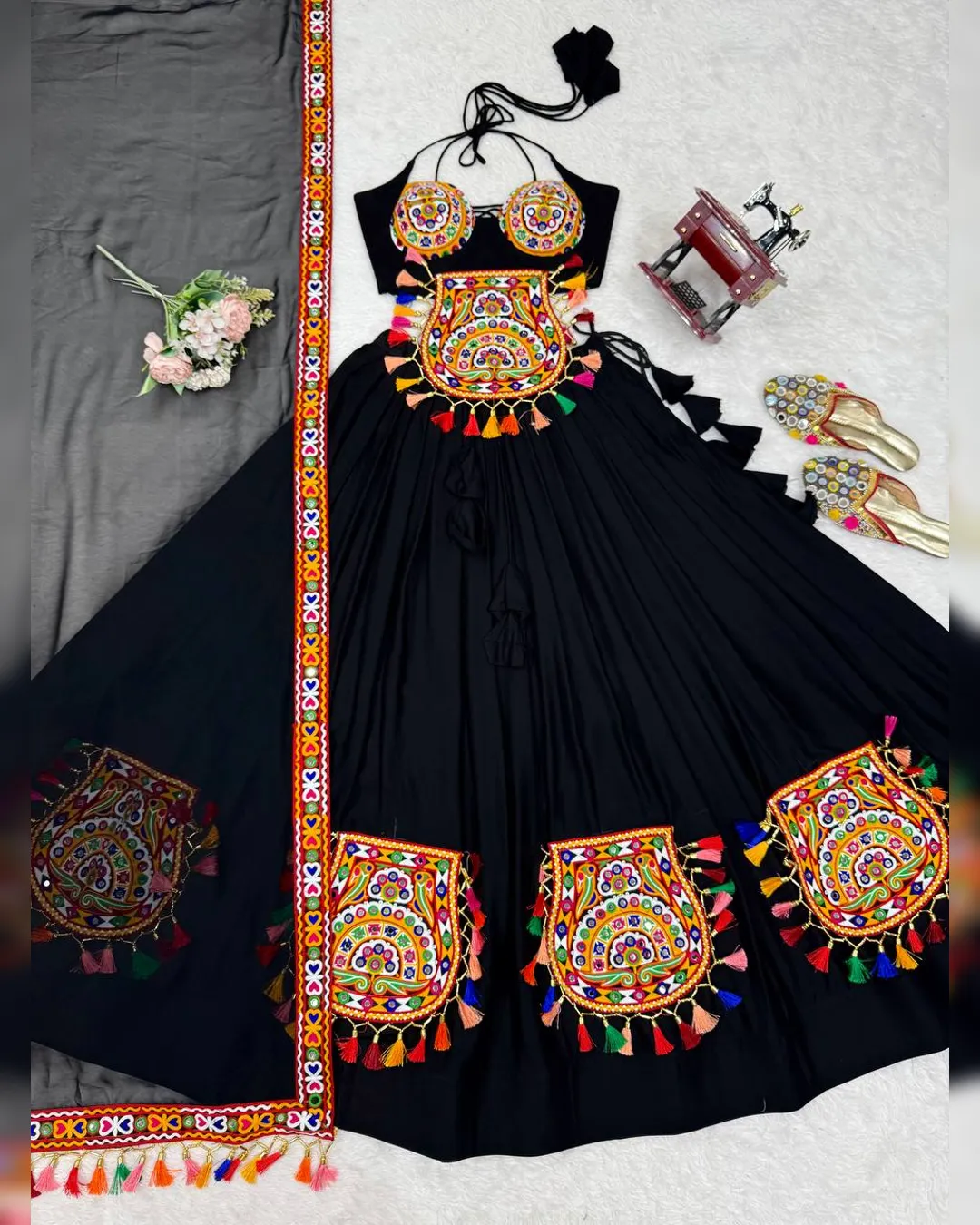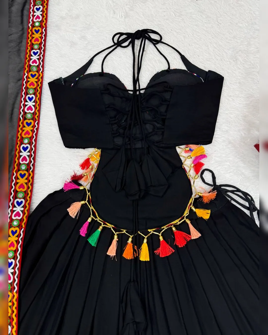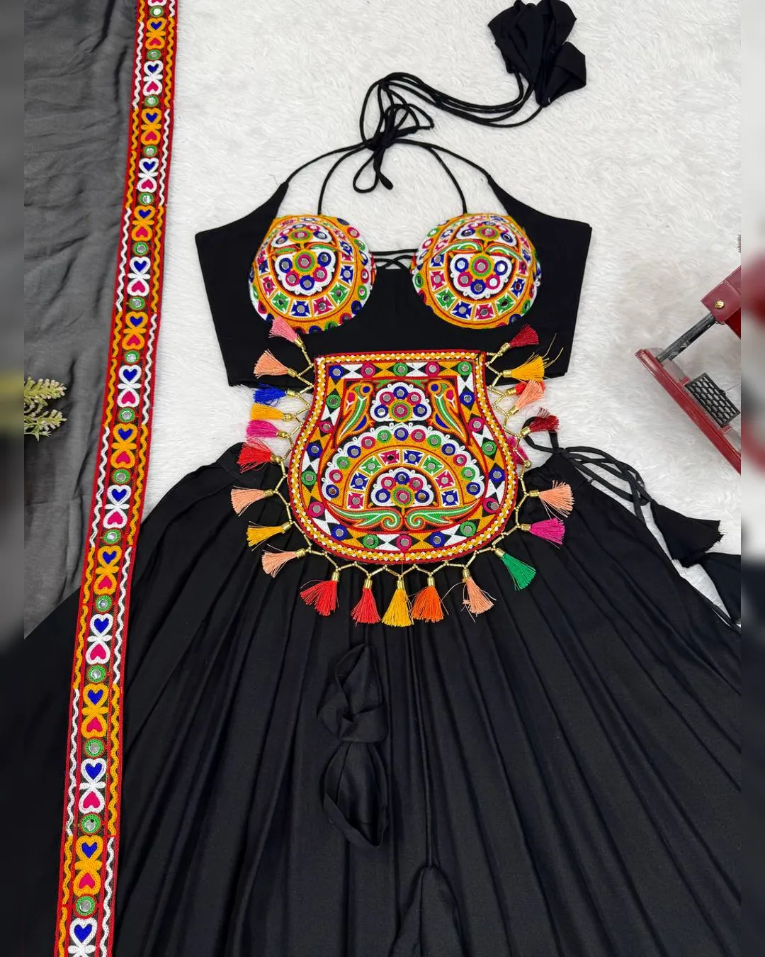 Celebrate the spirit of Navratri in this vibrant and traditional lehenga choli set, beautifully crafted in heavy rayon fabric and adorned with authentic Gamthi thread work, real mirror embellishments, and charming tassel accents.