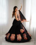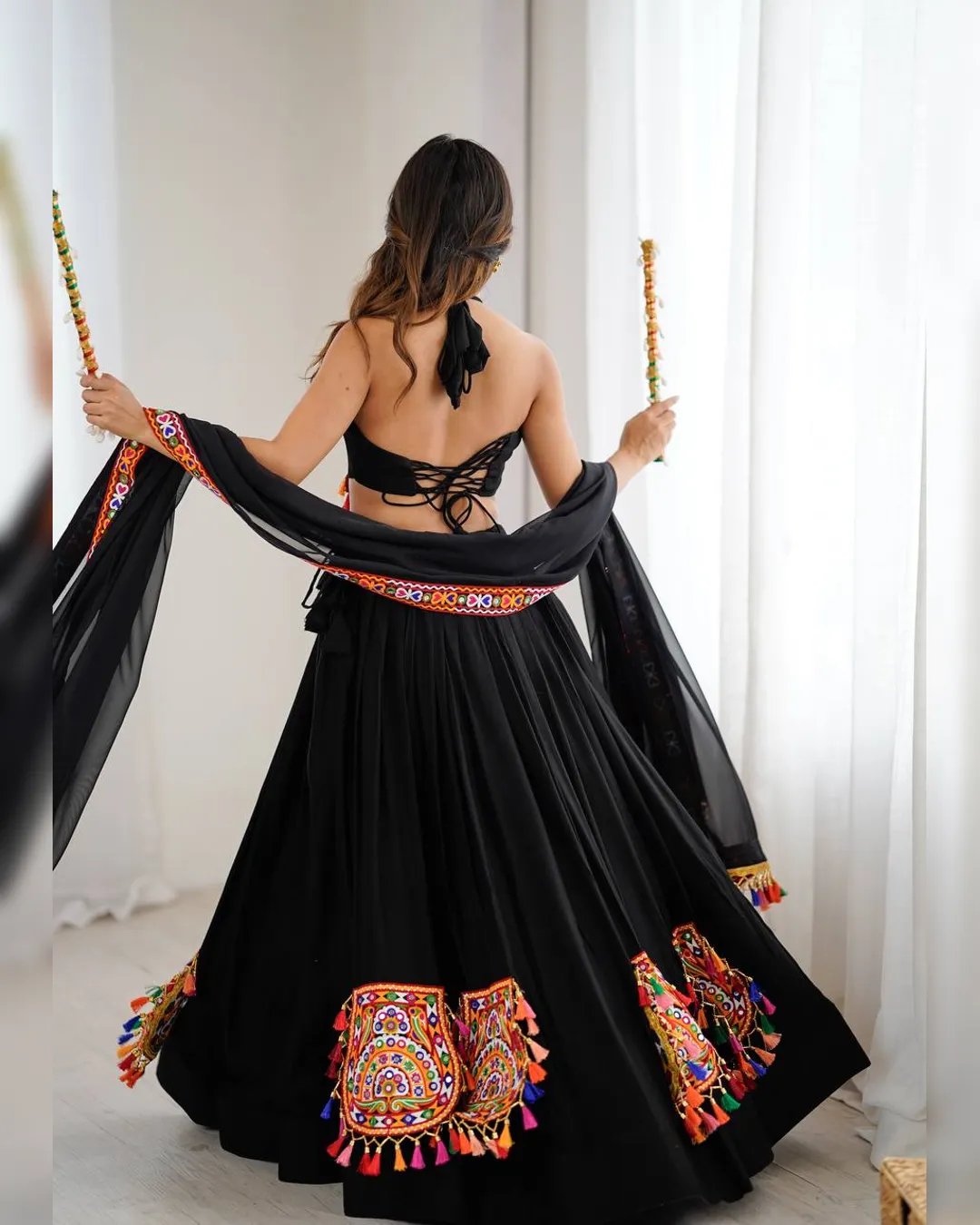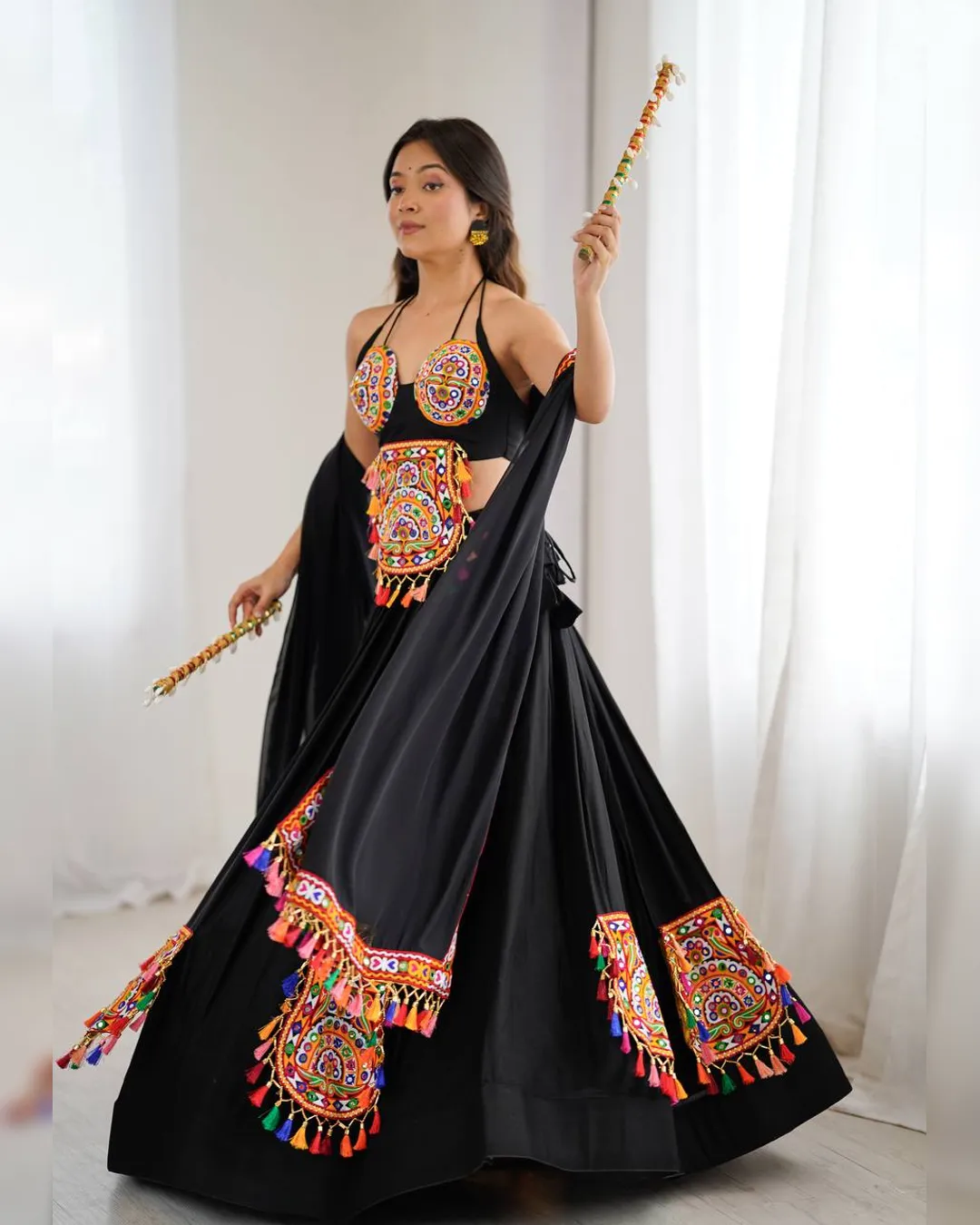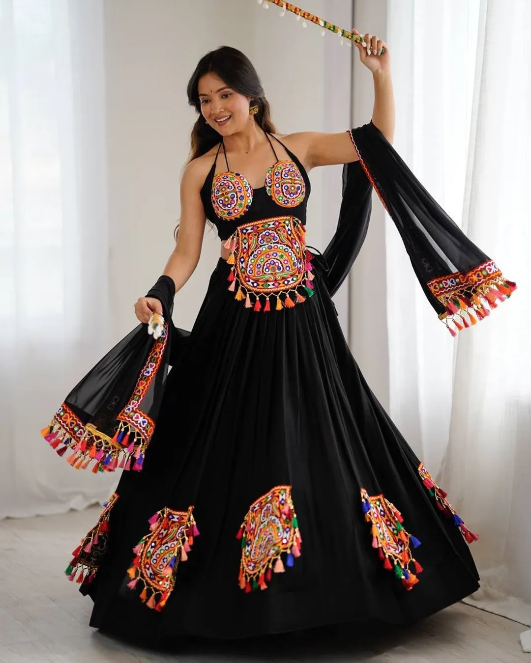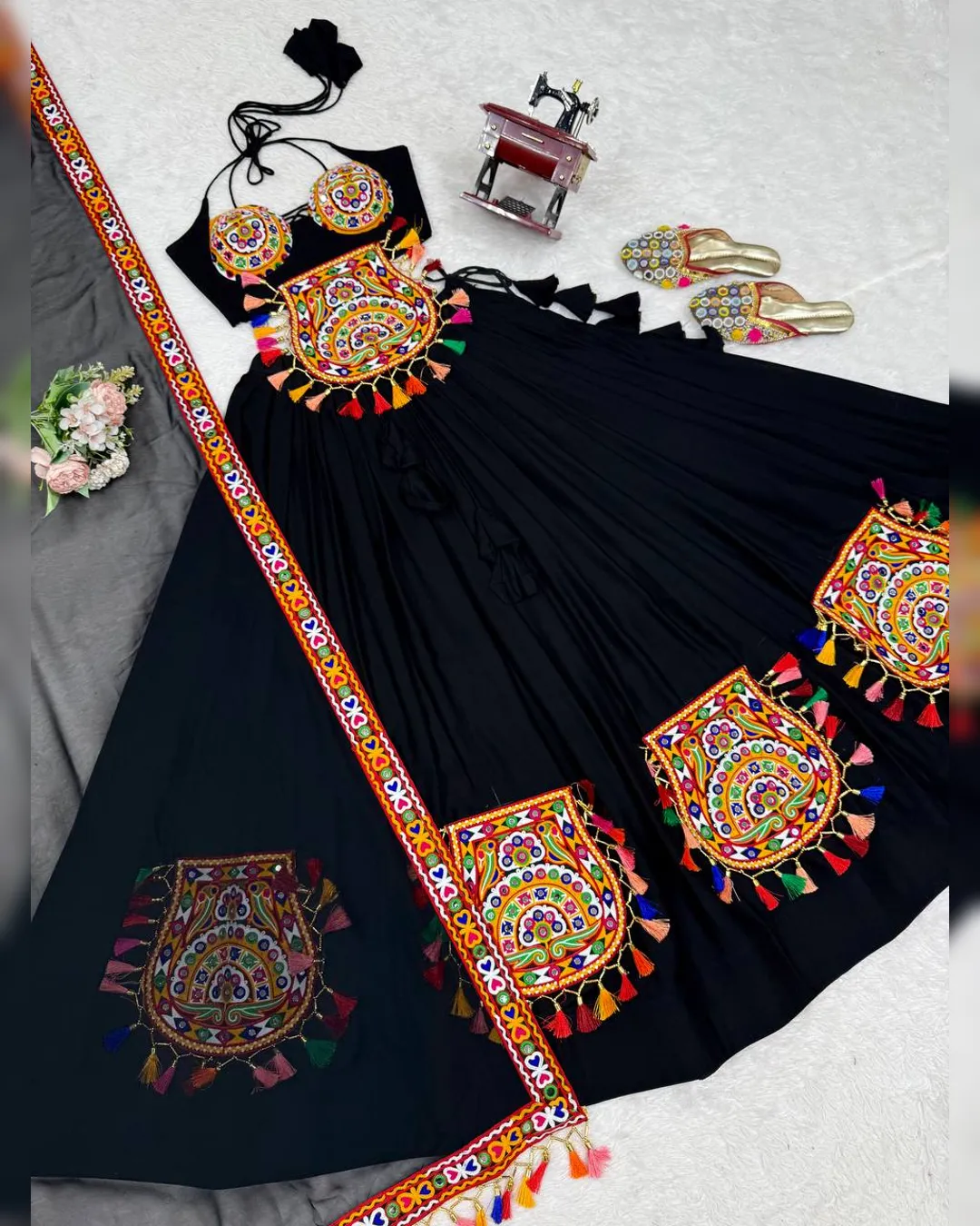 Celebrate the spirit of Navratri in this vibrant and traditional lehenga choli set, beautifully crafted in heavy rayon fabric and adorned with authentic Gamthi thread work, real mirror embellishments, and charming tassel accents.