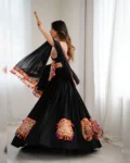 The lehenga features a grand 4.5-meter flair with a sturdy canvas patta for that perfect twirl. The choli is padded, fully stitched, and includes straps with tassels, offering both style and comfort. Completing the set is a graceful faux georgette dupatta enriched with Gamthi lace work and tassels, adding a festive touch.