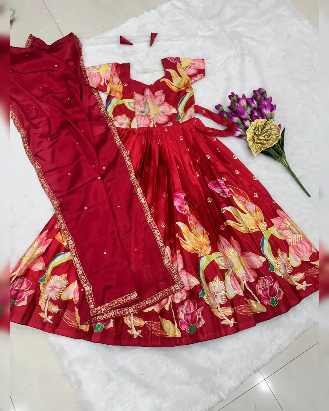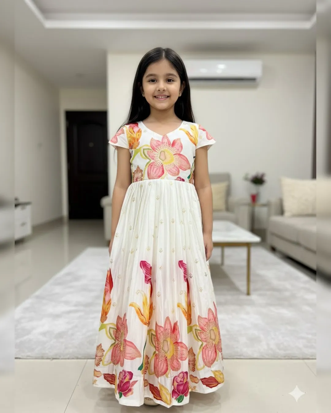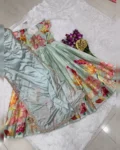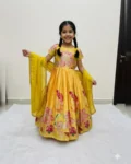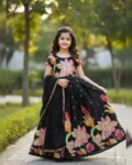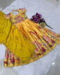Dress your little one in elegance with this beautifully crafted kids designer gown, made from premium pure Chinon silk fabric. This fully stitched gown features heavy position foil print work with a stunning full-position foil printed top, giving it a rich and festive appeal. Designed with an attached canvas finish and graceful full flair, the gown offers a perfect fall and royal look just like real model pictures. Soft heavy crepe lining from top to bottom ensures maximum comfort along with premium quality—ideal for weddings, festivals, parties, and special occasions.