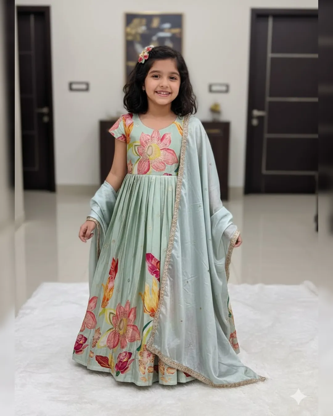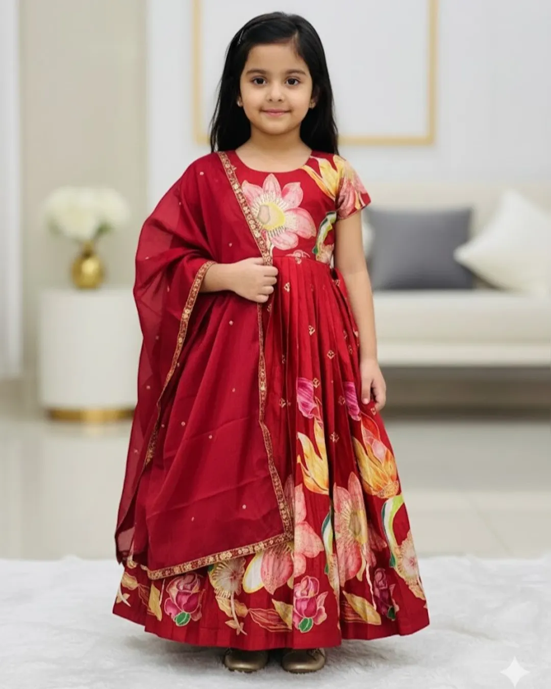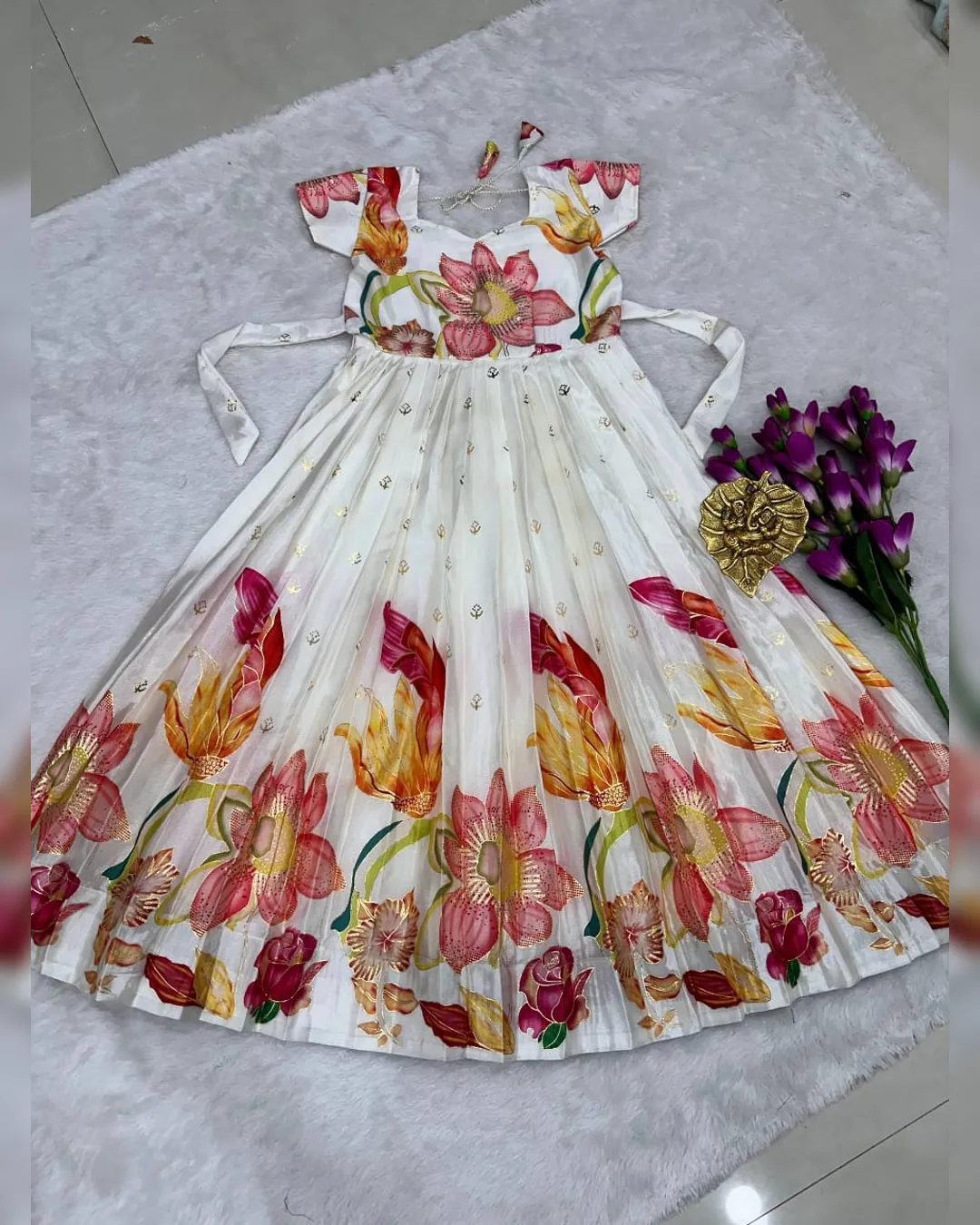 Premium kids full-flare gown in pure Chinon silk with heavy foil print work, canvas finish, and soft crepe lining for a royal festive look.