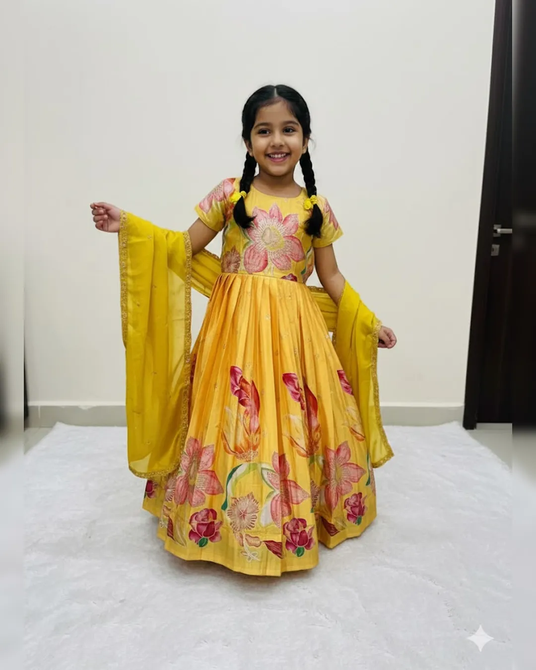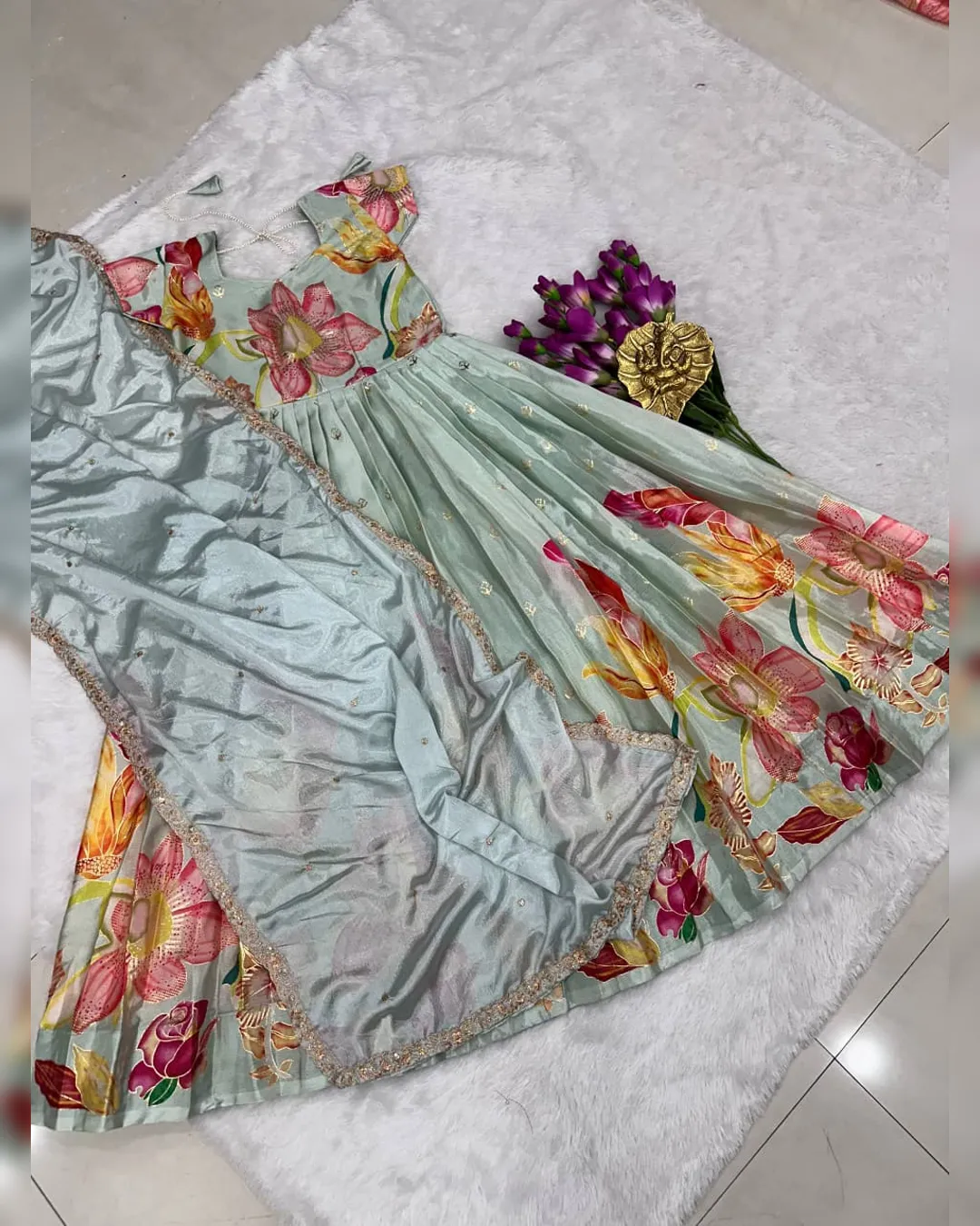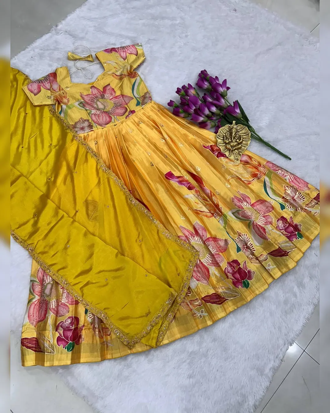Premium kids full-flare gown in pure Chinon silk with heavy foil print work, canvas finish, and soft crepe lining for a royal festive look.