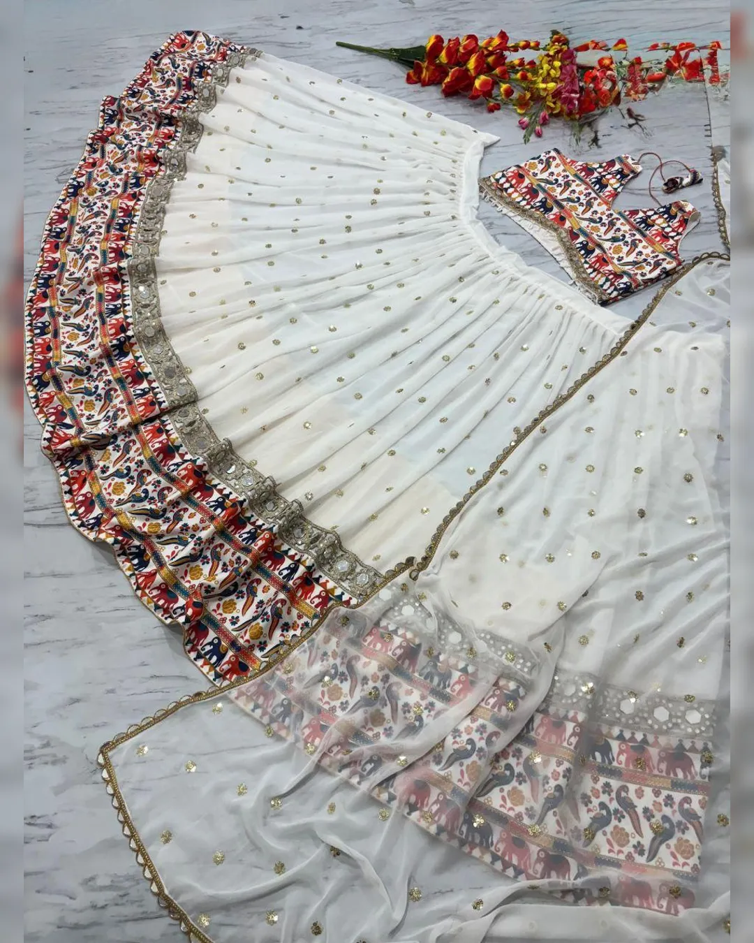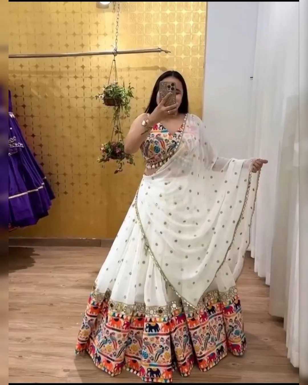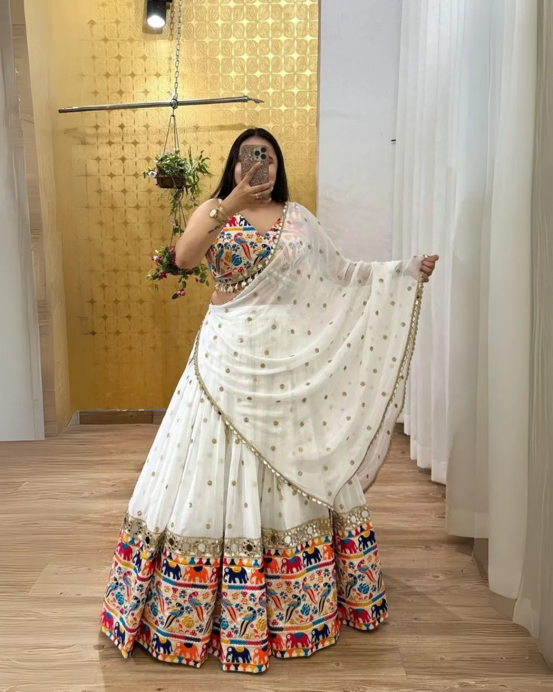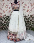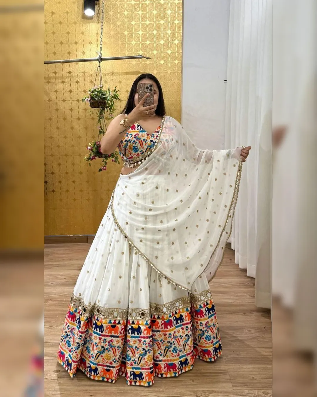 Step into the spotlight this Navratri with our most beautiful and exclusive designer lehenga, featuring dazzling real mirror work, rich digital prints, and premium embellishments. A perfect blend of traditional craftsmanship and contemporary style – designed to make you shine brighter than ever!