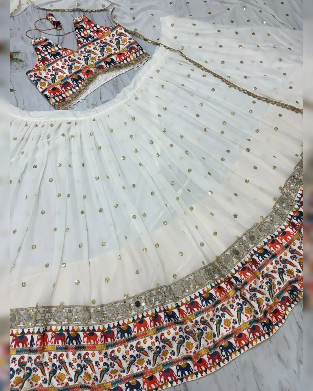 Premium Georgette Navratri Lehenga with stunning sequin and real mirror work, paired with printed satin silk blouse and mirror lace dupatta – perfect for festive flair.