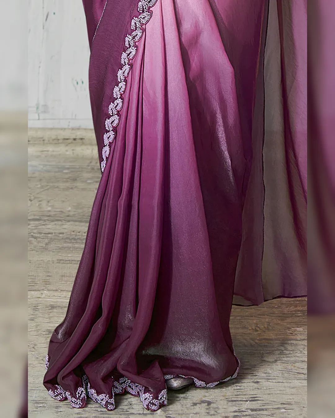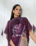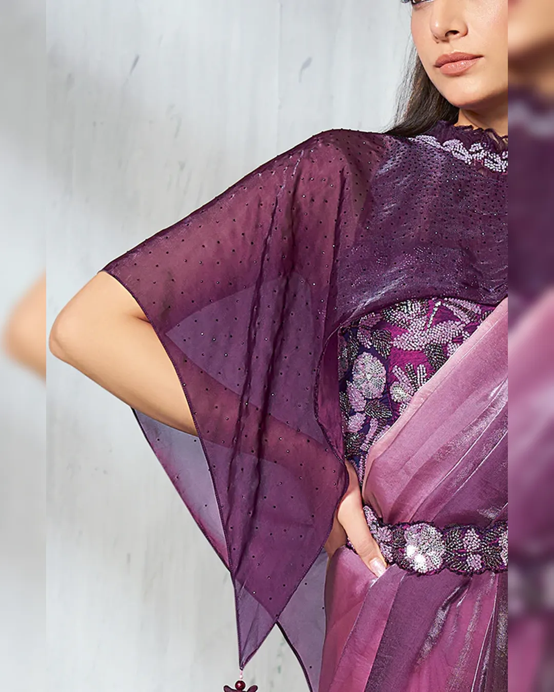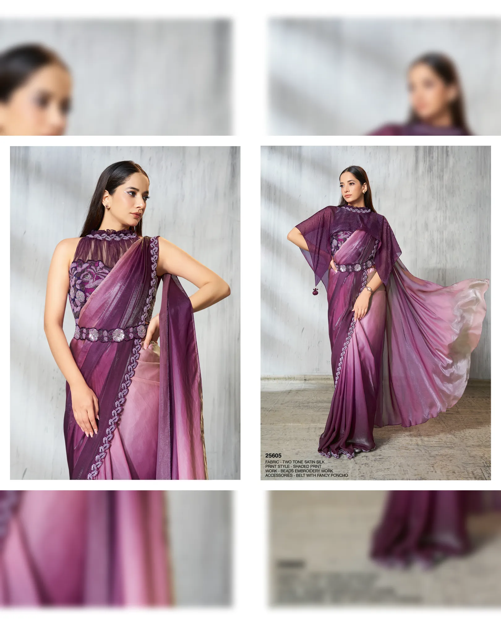 Ready-to-wear two-tone satin silk saree with beads and embroidery work, shaded print, designer belt, Fancy poncho, and stitched soft taffeta blouse.