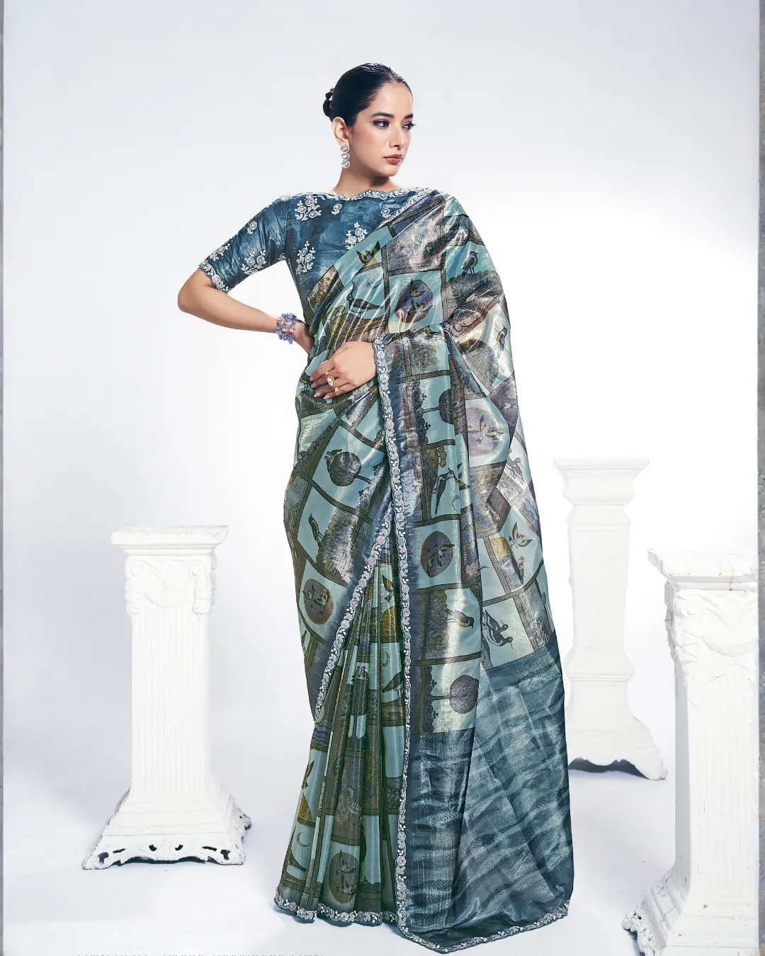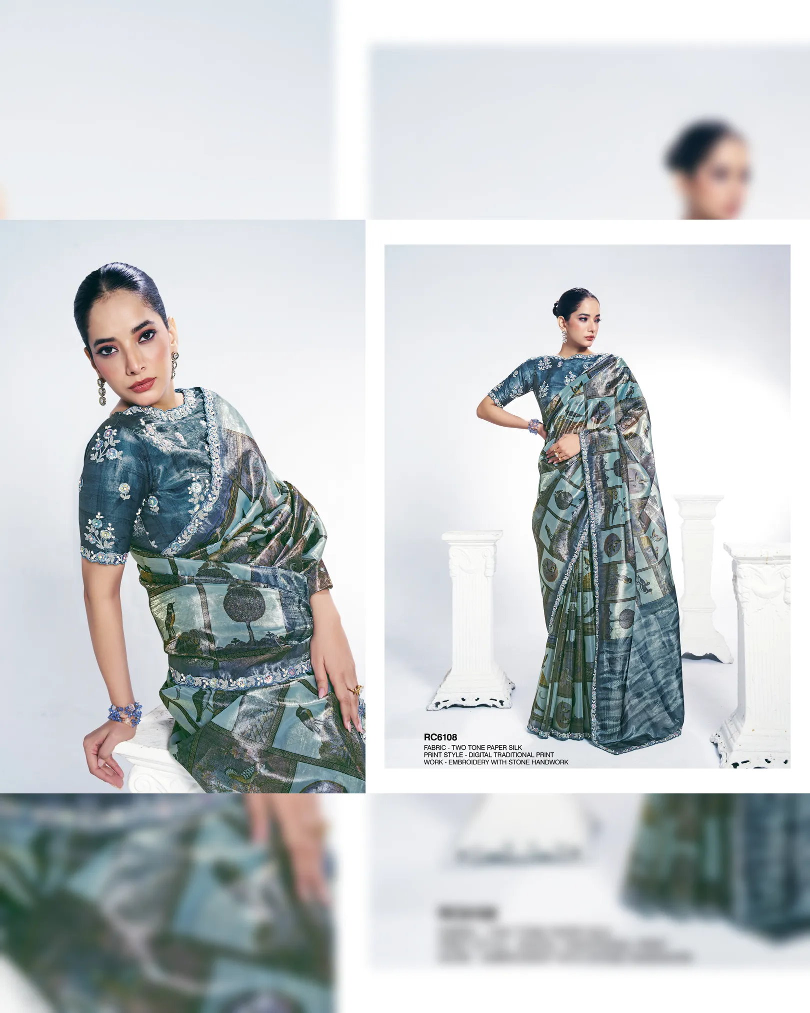 Two-tone paper silk designer saree featuring digital traditional print with embroidery and stone handwork, paired with a matching unstitched blouse.