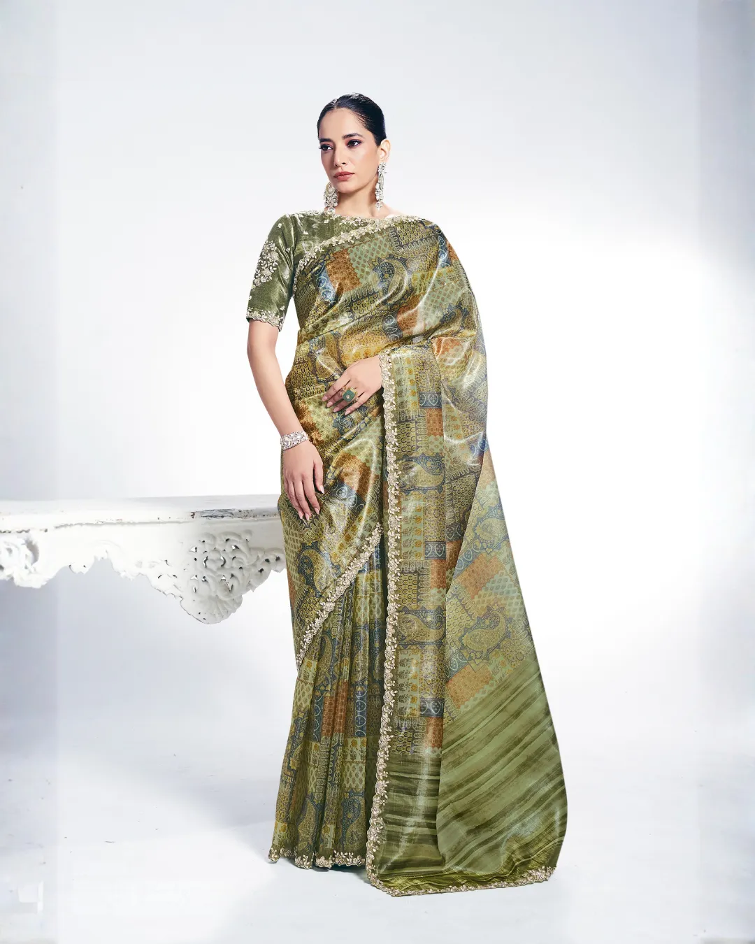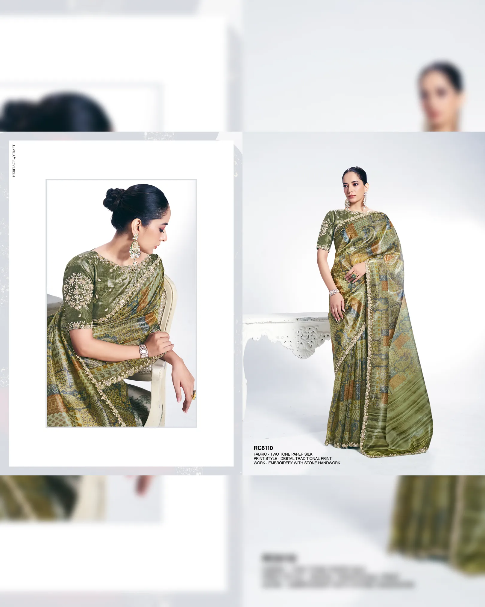 Elegant two-tone paper silk saree featuring digital traditional prints with embroidery and stone handwork, paired with a matching unstitched blouse.