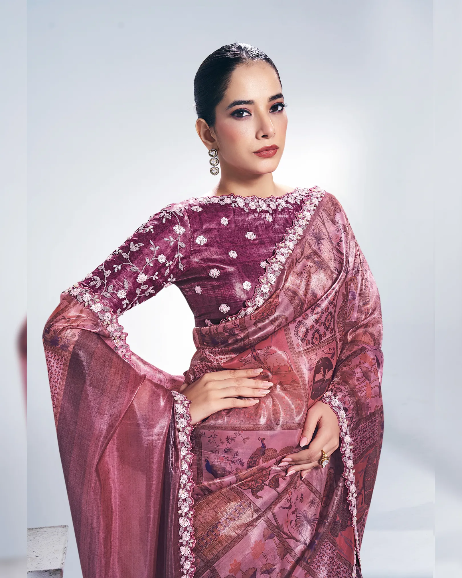 Festive two-tone paper silk saree featuring digital traditional prints with elegant embroidery and stone handwork, paired with an unstitched blouse.