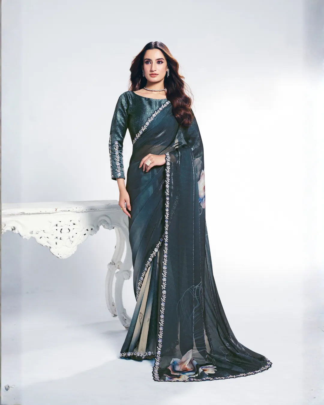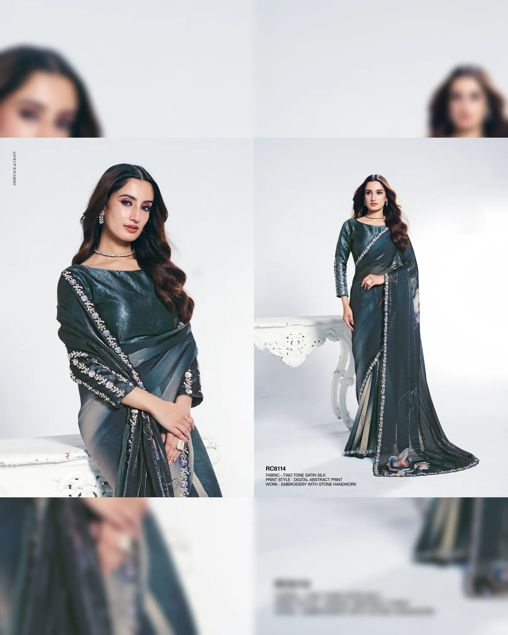 Elegant two-tone satin silk saree with modern digital abstract print, detailed embroidery, and stone handwork, paired with a silk jacquard unstitched blouse.