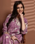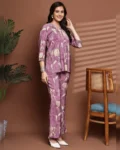 Step into elegance with this mauve, black, and white floral printed co-ord set, crafted in premium Chanderi silk for a soft, breezy feel. The set includes a stylish V-neck tunic with 3/4 sleeves paired with matching floral trousers, featuring a drawstring closure and functional pockets for extra ease and versatility.