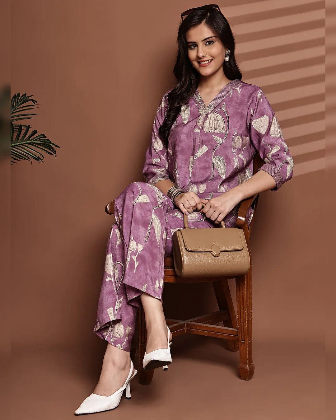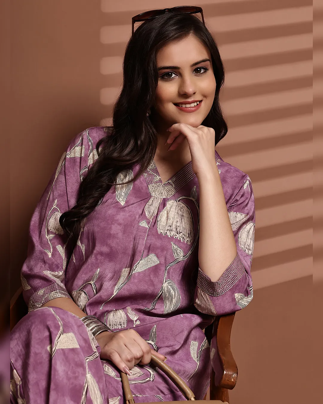 Mauve, black, and white floral printed Chanderi silk co-ord set with a V-neck tunic and drawstring trousers—elegance made effortless.