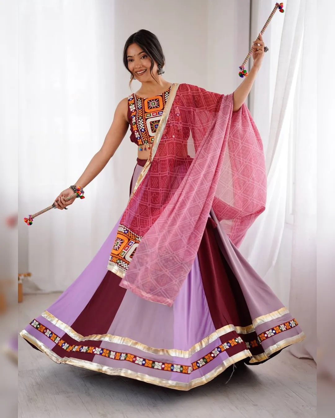 Bring vibrant elegance to your festive wardrobe with our Navratri Special Lehenga Choli Set, crafted with precision and tradition. Made from heavy rayon fabric, the lehenga and choli are adorned with authentic Gamthi thread work and real mirror embellishments, capturing the spirit of Garba nights and dandiya celebrations.