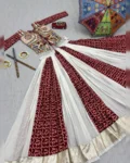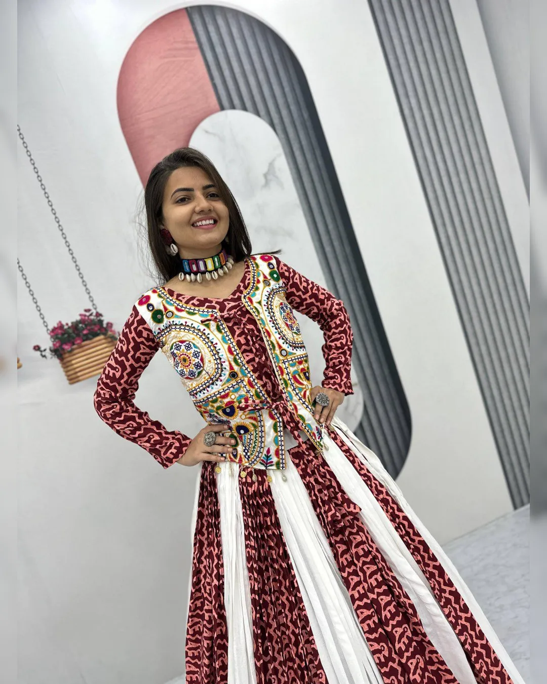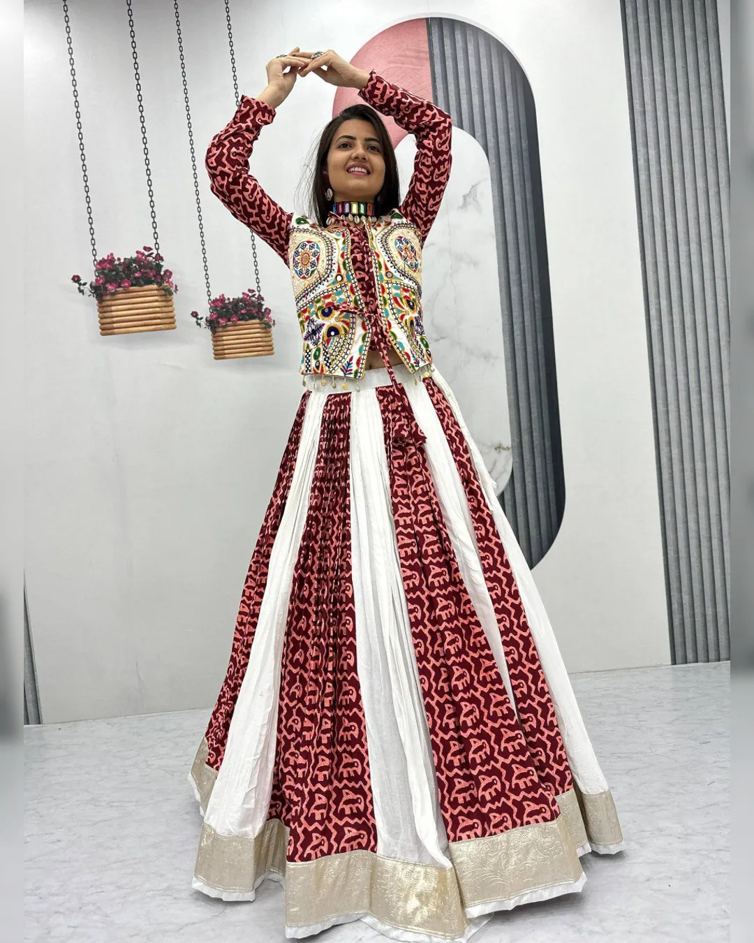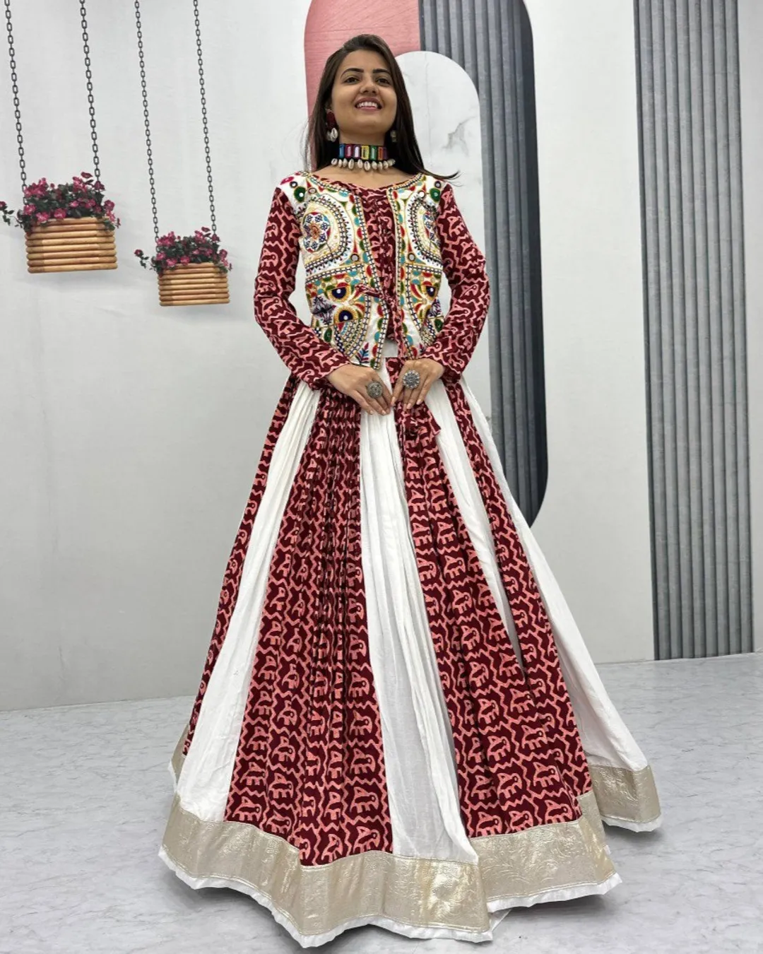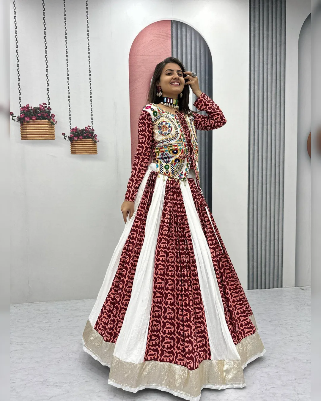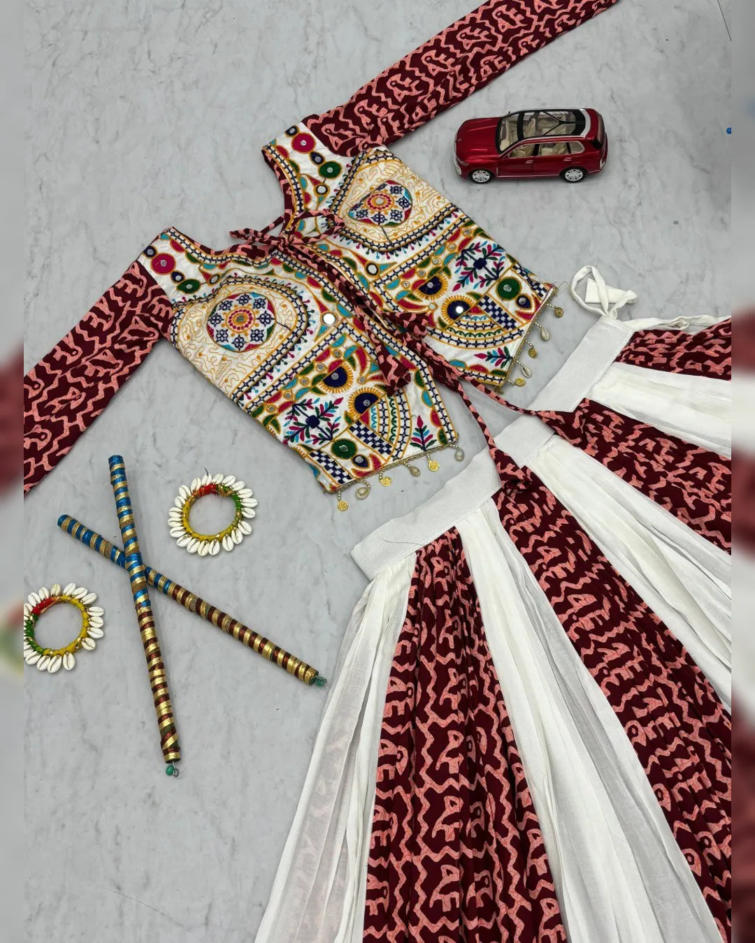 Navratri special pure cotton lehenga choli set with Gamthi embroidery, 6-meter flared lehenga with canvas patta, and fully stitched choli with micro cotton lining.