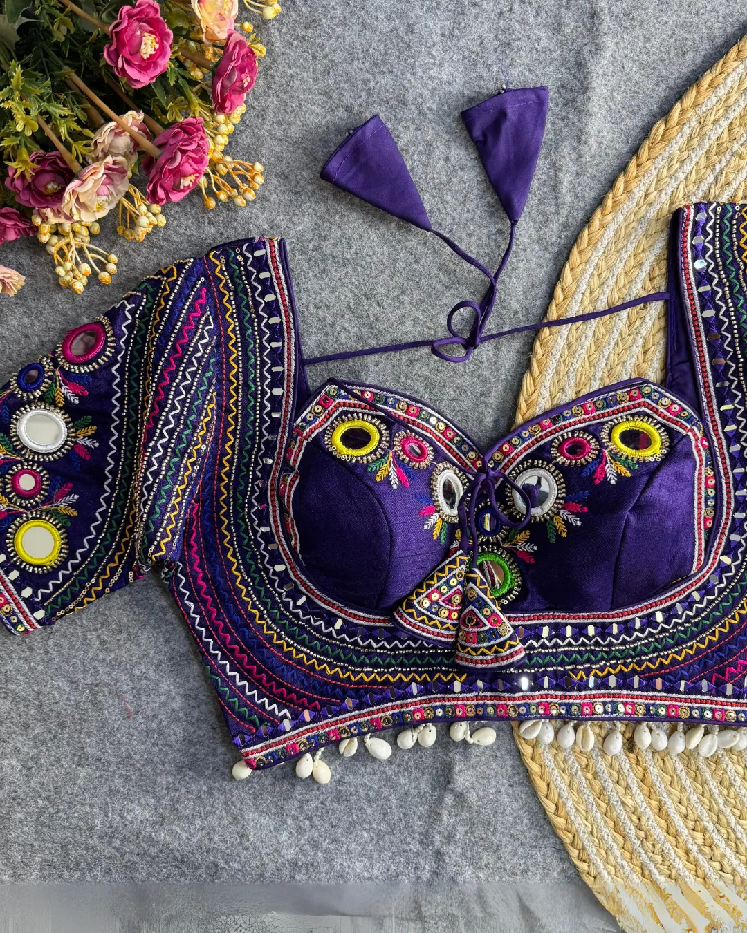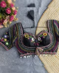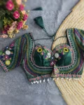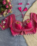 This exclusive blouse is highlighted with Gamthi motifs, Shell Lace Pattern, and heavy padding for a sculpted silhouette. The back open design adds a contemporary touch to the otherwise ethnic vibe – perfect to pair with lehengas, sarees, or skirts during Navratri nights.