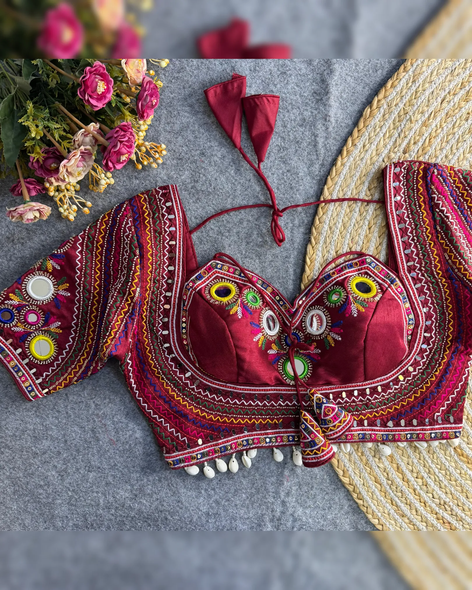 Masaba Style Real Mirror Work Navratri Blouse in Heavy Italian Silk – Size 40” Ready (Up to 42”) – 9 Colors – Back Open Design
